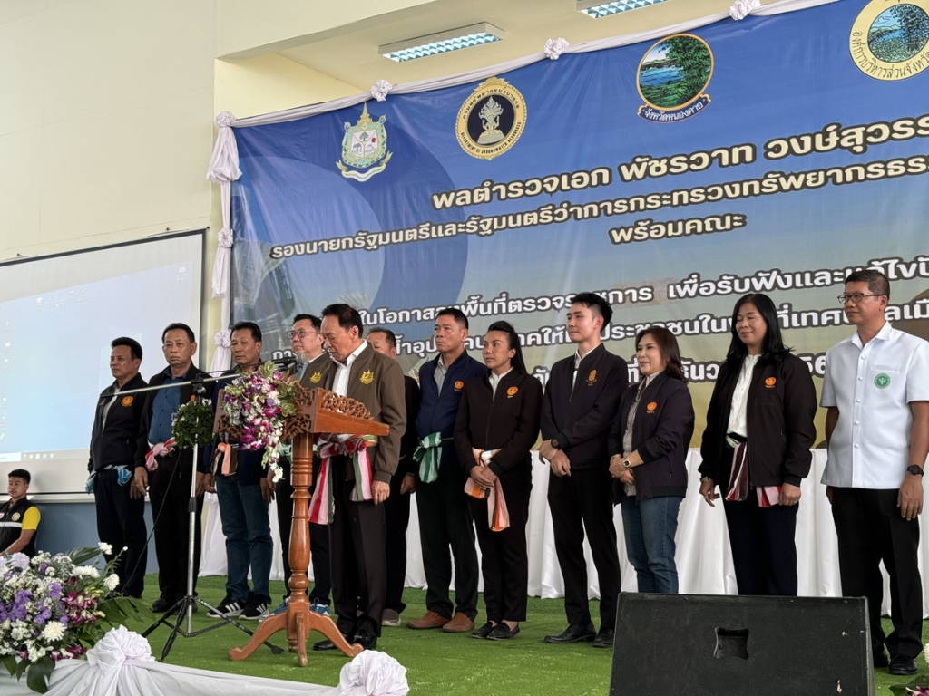 เมื่อเวลา 13.47 น.วันนี้ (3 ธันวาคม 2566) ณ หอประชุมเทศบาลเมืองท่าบ่อ อ.ท่าบ่อ จ.หนองคาย พล.ต.อ.พัชรวาท วงษ์สุวรรณ รองนายกรัฐมนตรีและรัฐมนตรีว่าการกระทรวงทรัพยากรธรรมชาติและสิ่งแวดล้อม พร้อมคณะผู้บริหารกระทรวงทรัพยากรธรรมชาติและสิ่งแวดล้อม ลงพื้นที่เพื่อรับฟังปัญหาความเดือดร้อนของประชาชน และรับข้อเสนอ โครงการจัดหาน้ำบาดาล ให้ความช่วยเหลือสนับสนุนการจัดหาน้ำบาดาล แก้ไขปัญหาการขาดแคลนน้ำอุปโภคบริโภค พื้นที่ตำบลท่าบ่อ อำเภอท่าบ่อ จังหวัดหนองคาย โดยมีนายชาญชัย คงทัน รองผู้ว่าราชการจังหวัดหนองคาย กล่าวต้อนรับ , นายกิตติศักดิ์ วรรณวิเชษฐ์ นายกเทศมนตรีเมืองท่าบ่อ กล่าวรายงานปัญหาการขาดแคลนน้ำในพื้นที่เทศบาลเมืองท่าบ่อ มีนายยุทธนา ศรีตะบุตร นายก อบจ.หนองคาย , นายกระแสร์ ตระกูลพรพงศ์ ส.ส.หนองคาย เขต 1 พร้อมหัวหน้าส่วนราชการ หน่วยงานที่เกี่ยวข้อง และชาวจังหวัดอำเภอท่าบ่อ ร่วมให้การต้อนรับ