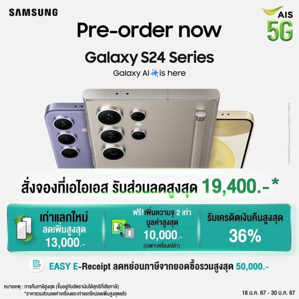 AIS เอาใจสาวก Samsung จัดเต็มความพิเศษมากกว่าใครเมื่อสั่งจอง Samsung Galaxy S24 Series กับ AIS ให้ลูกค้าได้สัมผัสประสบการณ์ด้วยพลังแห่ง Galaxy AI บนโครงข่ายอัจฉริยะ AIS 5G พร้อมข้อเสนอและสิทธิพิเศษอีกมากมาย ไม่ว่าจะเป็น ฟรี!! เพิ่มความจุเครื่อง 2 เท่า, เครื่องเก่ามีมูลค่ารับส่วนลดเพิ่ม และคุ้มกว่าเมื่อสมัครใช้แพ็กเกจ และ มี AIS Point รับส่วนลดเพิ่ม รวมถึงยังได้รับสิทธิในการรับชมความบันเทิงจากแอปดังทั่วเอเชียกับแพ็ก PLAY ASIAN และ ดูแลเครื่องกับ Samsung Care+