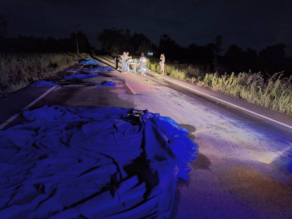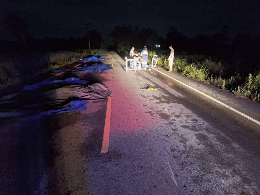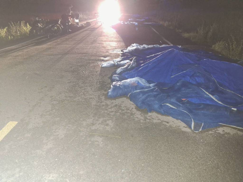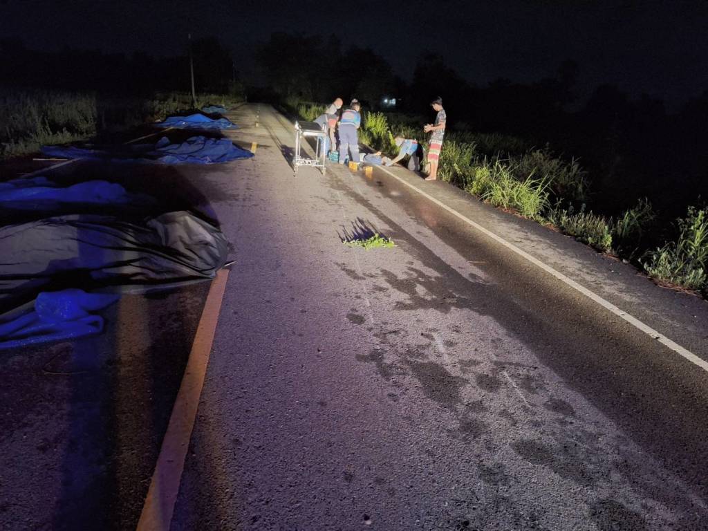 โดยบริเวณจุดเกิดเหตุยังพบข้าวเปลือกที่ตากไว้บนถนนเต็ม 1 ช่องจราจร กระจัดกระจาย