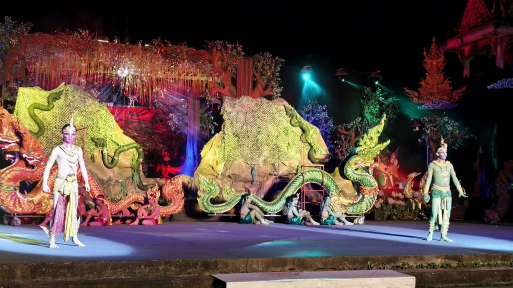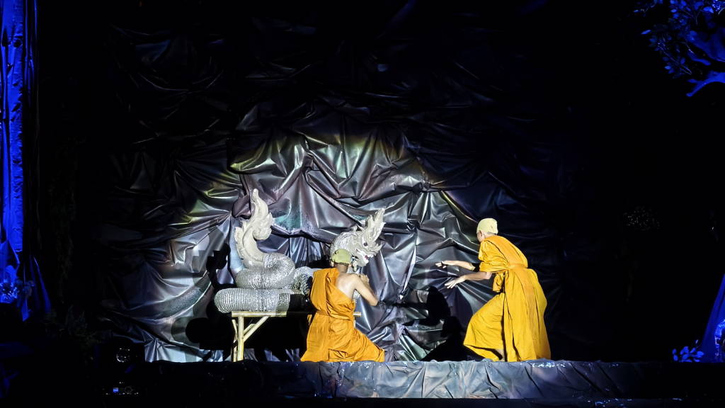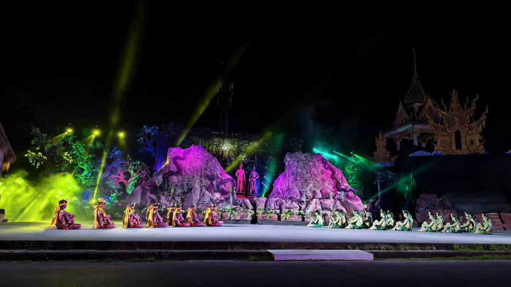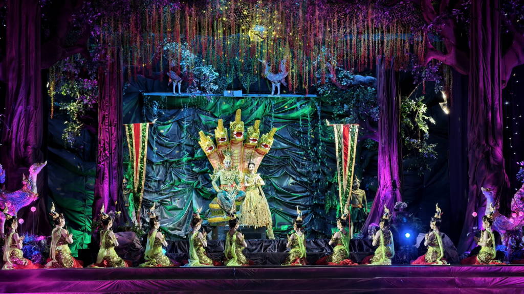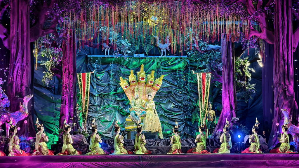 การแสดงแสง สี เสียง “เปิดตำนานบั้งไฟพญานาค” ที่จัดให้มีขึ้นในครั้งนี้ เป็นการแสดงในปีที่ 24 ในชื่อชุด มหาพุทธบูชา นาคประทีป นาฎนันทการ โดยนักแสดงและทีมงานชมรมนาฏศิลป์หนองคายกว่า 260 คน ใช้ระยะเวลาในการแสดงกว่า 1.20 ชม. ซึ่งเป็นการถ่ายทอดเรื่องราวความเชื่อที่ชาวหนองคายมีต่อบั้งไฟพญานาค ว่าเกิดจากพญานาคซึ่งมีความศรัทธาต่อพระสัมมาสัมพุทธเจ้า ได้พ่นลูกไฟถวายขึ้นเป็นพุทธบูชา ในขณะที่พระพุทธเจ้าเสด็จจากสวรรค์ชั้นดาวดึงส์เพื่อโปรดพระมารดา ในค่ำคืนวันเพ็ญ ขึ้น 15 ค่ำ เดือน 11 ซึ่งจะทำการแสดงอีก 2 วัน คือวันที่ 6 – 7 ตุลาคม 2568 เริ่มตั้งแต่ เวลา 19.00 น. เป็นต้นไป ทุกปีที่ผ่านมาการแสดงชุดนี้ได้รับความสนใจจากนักท่องเที่ยวและประชาชนชาวหนองคาย ชมการแสดงอย่างคับคั่ง และเป็นกิจกรรมที่ได้รับความสนใจเป็นอย่างมากในบรรดากิจกรรมต่าง ๆ ของจังหวัดหนองคายที่จัดขึ้นในช่วงงานประเพณีออกพรรษาและบั้งไฟพญานาคโลก.