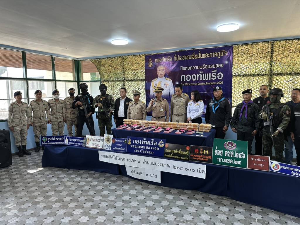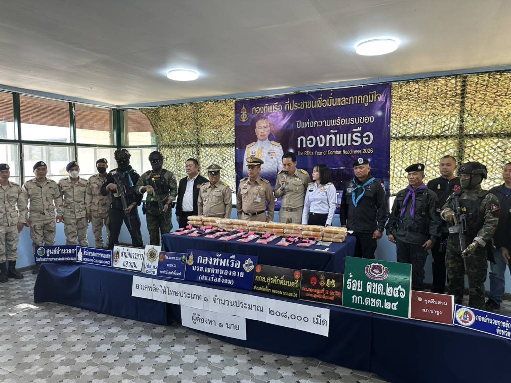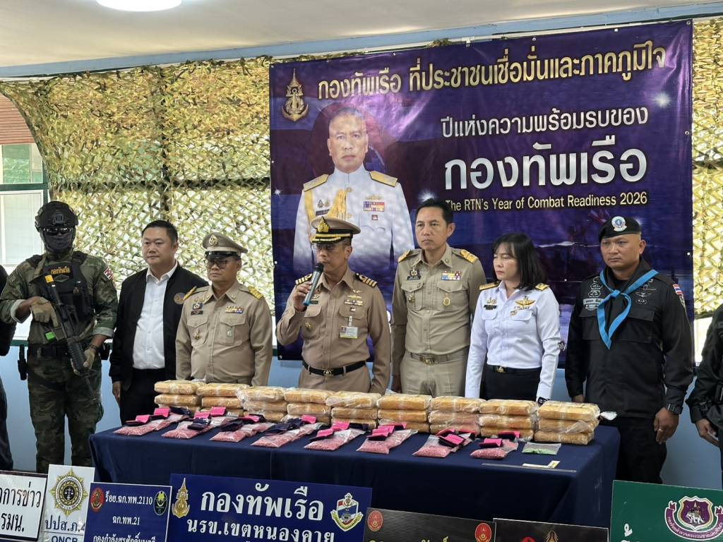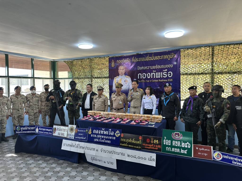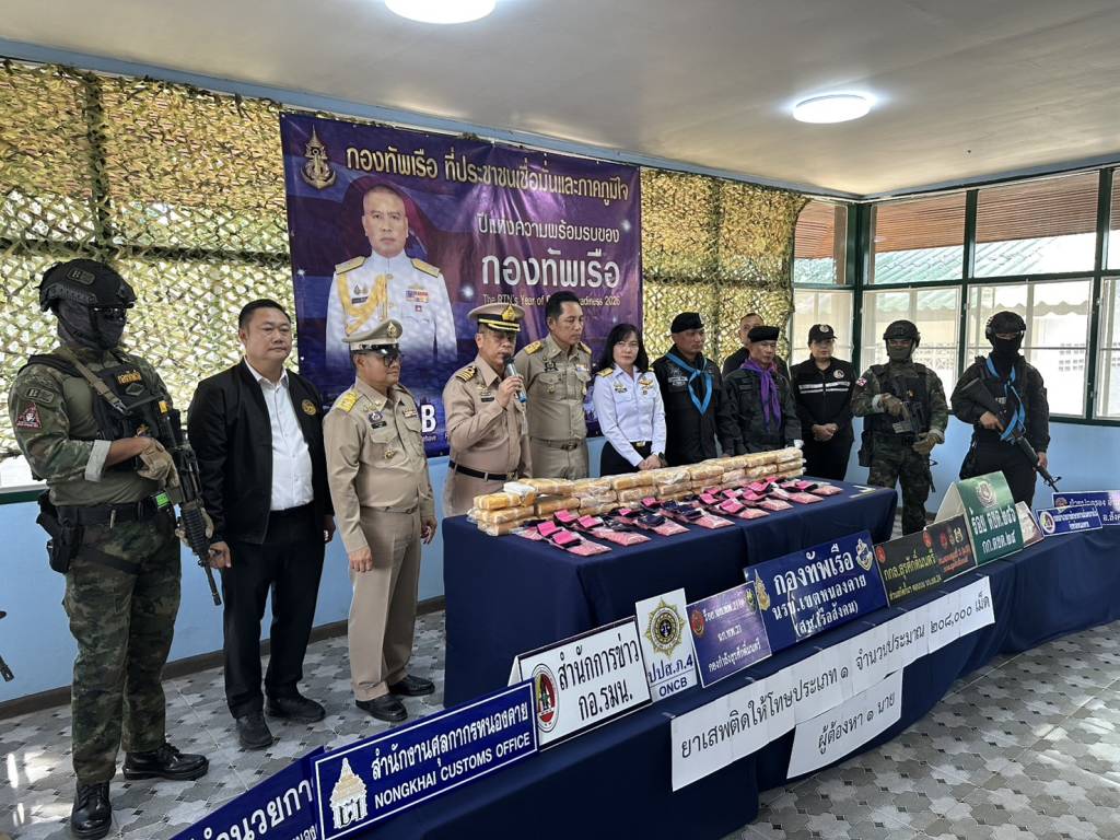 วันนี้ (27 พ.ย. 68) เวลา 14.30 น. ที่สถานีเรือสังคม (นรข.เขตหนองคาย) ต.สังคม อ.สังคม จ.หนองคาย นายไพฑูรย์ มหาชื่นใจ รองผู้ว่าราชการจังหวัดหนองคาย ,น.อ.วิศิษฐ์พงศ์ เจริญวิชยเดช ผบ.นรข.เขตหนองคาย ,นายนวน โทบุตร นายอำเภอสังคม ,ร.อ.ไพรสน พลเสน หัวหน้าสถานีเรือสังคม (นรข.เขตหนองคาย) ,ร.อ.ยุทธณา สีไชย์ ผู้บังคับกองร้อยเฉพาะกิจทหารพรานที่ 2110 หน่วยเฉพาะกิจทหารพรานที่ 21 ,นางสาววรรณา ผู้อุตส่าห์ นายด่านศุลกากรหนองคาย , พร้อมหน่วยงานที่เกี่ยวข้อง ร่วมกันแถลงข่าวตรวจยึดยาบ้า จำนวน 208,000 เม็ด พร้อมผู้ต้องหา นายวีระพล อุดม อายุ 27 ปี อยู่บ้านเลขที่ 12 ม.1 ต.นางัว อ.น้ำโสม จ.อุดรธานี