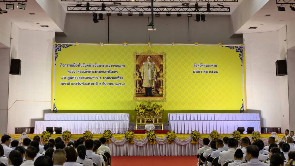 เช้าวันนี้ (5 ธันวาคม 2568) ณ หอประชุมประจักษศิลปาคม ศาลากลางจังหวัดหนองคาย อ.เมืองหนองคาย จ.หนองคาย จังหวัดหนองคาย ได้จัดกิจกรรมเนื่องในวันคล้ายวันพระบรมราชสมภพพระบาทสมเด็จพระบรมชนกาธิเบศร มหาภูมิพลอดุลยเดชมหาราช บรมนาถบพิตร วันชาติ และวันพ่อแห่งชาติ 5 ธันวาคม 2568 เพื่อถวายเป็นพระราชกุศลและน้อมรำลึกในพระมหากรุณาธิคุณพระบาทสมเด็จพระบรมชนกาธิเบศร มหาภูมิพลอดุลยเดชมหาราช บรมนาถบพิตร ที่ทรงบำเพ็ญพระราชกรณียกิจนานัปการ เพื่อบำบัดทุกข์ บำรุงสุขแก่ปวงชนชาวไทย