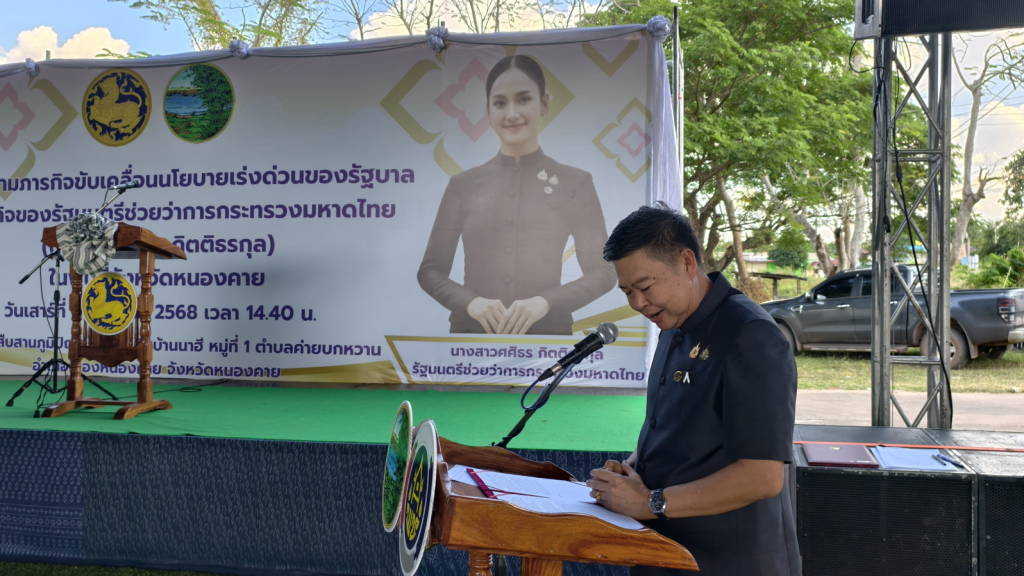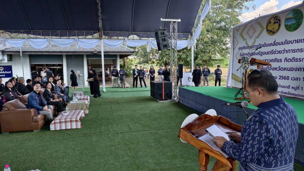 นายไพโรจน์ โสภาพร รองอธิบดีกรมการพัฒนาชุมชน ในนามของกรมการพัฒนาชุมชน กระทรวงมหาดไทย กล่าวรายงานว่า วันนี้นับเป็นโอกาสอันสำคัญยิ่ง ที่ข้าราชการและเจ้าหน้าที่พัฒนาชุมชนจังหวัดหนองคาย รวมถึงประชาชน และภาคีเครือข่ายงานพัฒนาชุมชน ได้มีโอกาสรับฟังนโยบายและแนวทางการขับเคลื่อนงานจากท่านรัฐมนตรีช่วยว่าการกระทรวงมหาดไทย ซึ่งถือเป็นขวัญและกำลังใจในการปฏิบัติงาน ตลอดจนเป็นแนวทางในการเสริมสร้างศักยภาพการทำงานให้มีประสิทธิภาพยิ่งขึ้น นโยบายที่รัฐมนตรีฯ จะได้มอบในวันนี้ ล้วนมีความสอดคล้อง กับนโยบายของรัฐบาล ภายใต้การนำของ นายอนุทิน ชาญวีรกูล นายกรัฐมนตรี ซึ่งมุ่งเน้นการพัฒนาเศรษฐกิจฐานรากอย่างมั่นคงและยั่งยืน ขับเคลื่อน “เดินหน้า ไร้รอยต่อ”.โดยการส่งเสริมอาชีพ สร้างรายได้ให้กับประชาชน ลดความเหลื่อมล้ำและยกระดับคุณภาพชีวิตของพี่น้องประชาชนให้ดีขึ้นในทุกมิติ พร้อมทั้งยังสอดคล้องกับนโยบายของกรมการพัฒนาชุมชน ในการขับเคลื่อนงานตาม 4 ประเด็นหลัก ได้แก่ การขับเคลื่อนบุคลากรของกรมการพัฒนาชุมชน เพื่อเป็นเพื่อนคู่คิดในการแก้ไขปัญหาและแสวงหาความร่วมมือจากภาคีการพัฒนา , การขับเคลื่อนงานตามพันธกิจและภารกิจของกรมการพัฒนาชุมชน ผ่านกระบวนการสร้างผู้นำชุมชน , การขับเคลื่อนนโยบายรัฐบาล/กระทรวงมหาดไทย ที่มอบหมายให้กรมการพัฒนาชุมชนรับผิดชอบ และการสร้างเสริมสถาบันหลักของชาติ เพื่อนำไปสู่เป้าหมาย “เศรษฐกิจฐานรากมั่นคง ชุมชนเข้มแข็งอย่างยั่งยืน ด้วยหลักปรัชญาของเศรษฐกิจพอเพียง”
