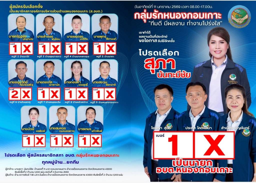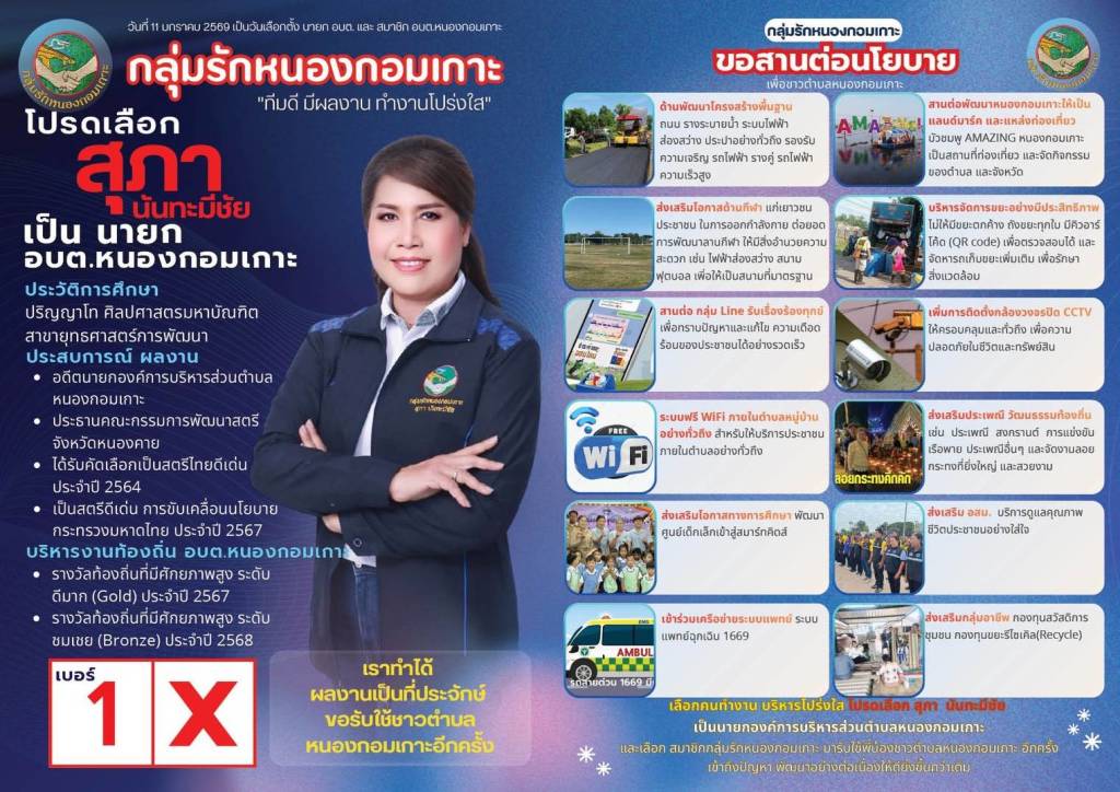 นางสุภา นันทะมีชัย ผู้สมัครตำแหน่งนายก อบต.หนองกอมเกาะ เบอร์ 1 เปิดเผยว่า ในการเลือกตั้งตำแหน่ง นายกองค์การบริหารส่วนตำบลหนองกอมเกาะ และ สมาชิกสภาองคืการบริหารส่วนตำบลหนองกอมกเ ในวันที่ 11 มกราคม 2569 ที่จะถึงนี้ ตนได้นำกลุ่ม “รักหนองกอมเกาะ” ชูนโยบาย ทำดี มีผลงาน ทำงานโปร่งใส ขอโอกาสกลับมาพัฒนาตำบลหนองกอมเกาะอีกครั้งเพื่อสานงานทุกโครงการฯ ที่ทำไว้แล้วต่อยอดเพื่อพัฒนาพื้นที่