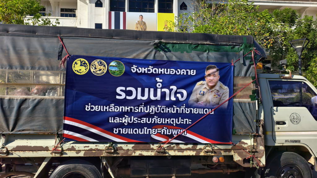 ผู้ว่าราชการจังหวัดหนองคาย พร้อมส่วนราชการ หน่วยงาน ในจังหวัดหนองคาย ร่วมส่งกำลังใจ ส่งขบวนรถบรรทุกสิ่งของ รวมน้ำใจ ช่วยเหลือทหารที่ปฏิบัติหน้าที่ชายแดนและผู้ประสบภัยเหตุปะทะชายแดนไทย-กัมพูชา