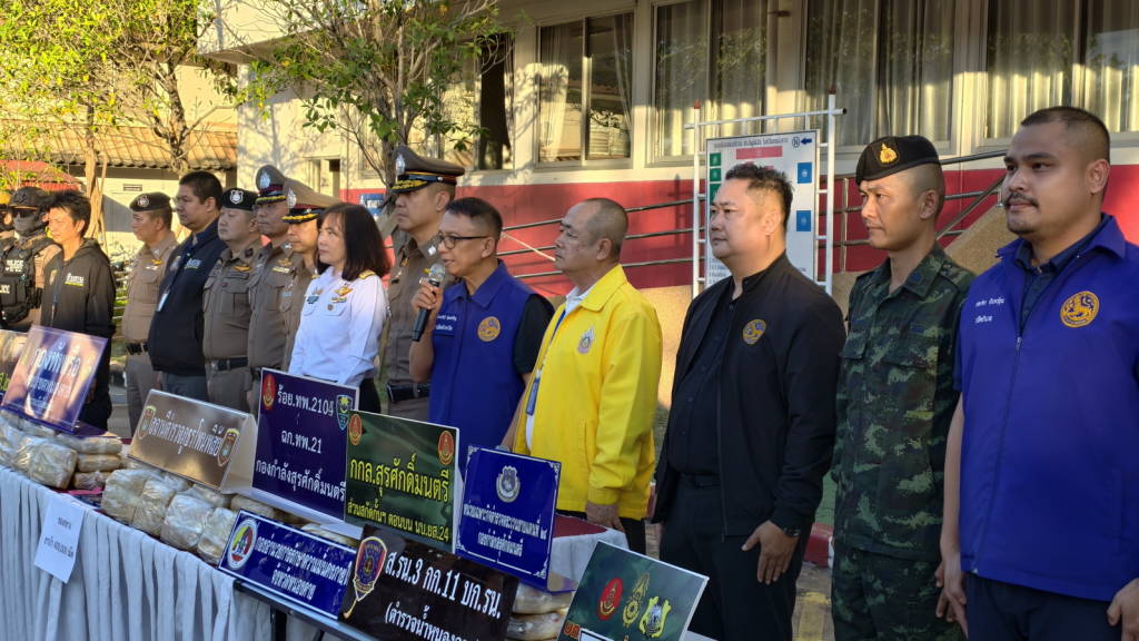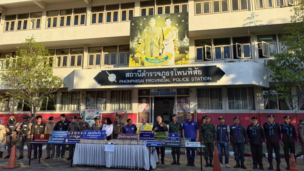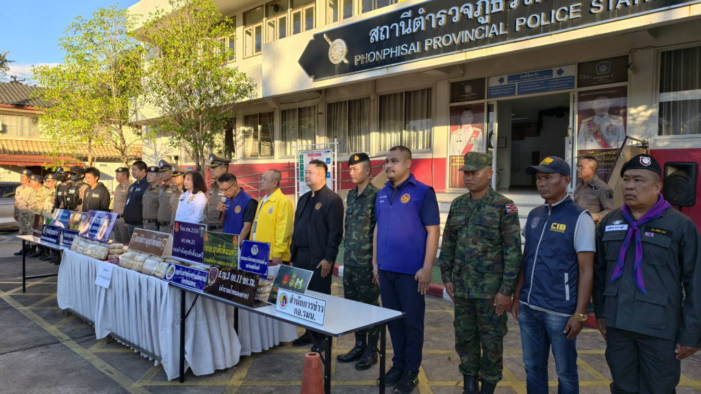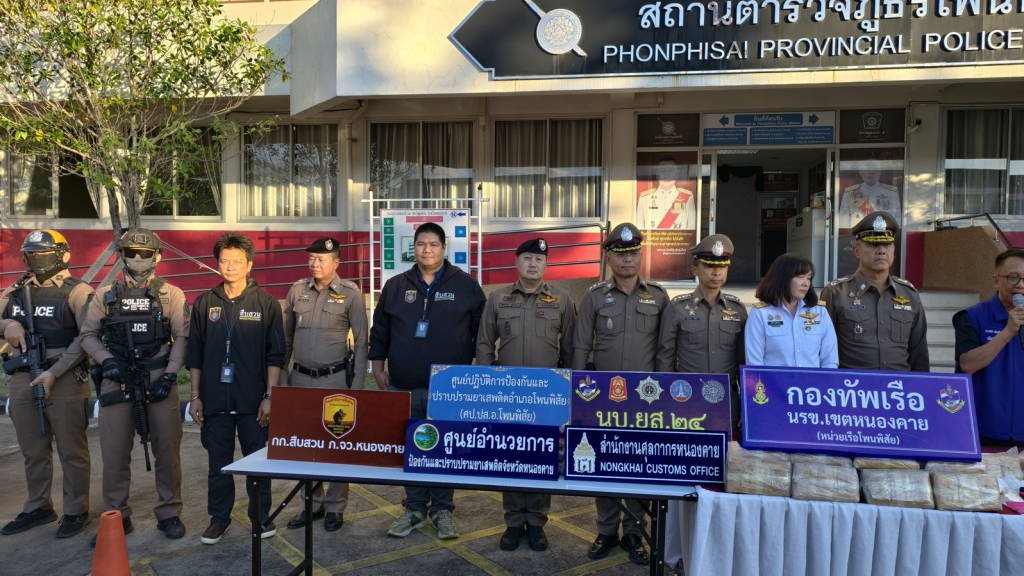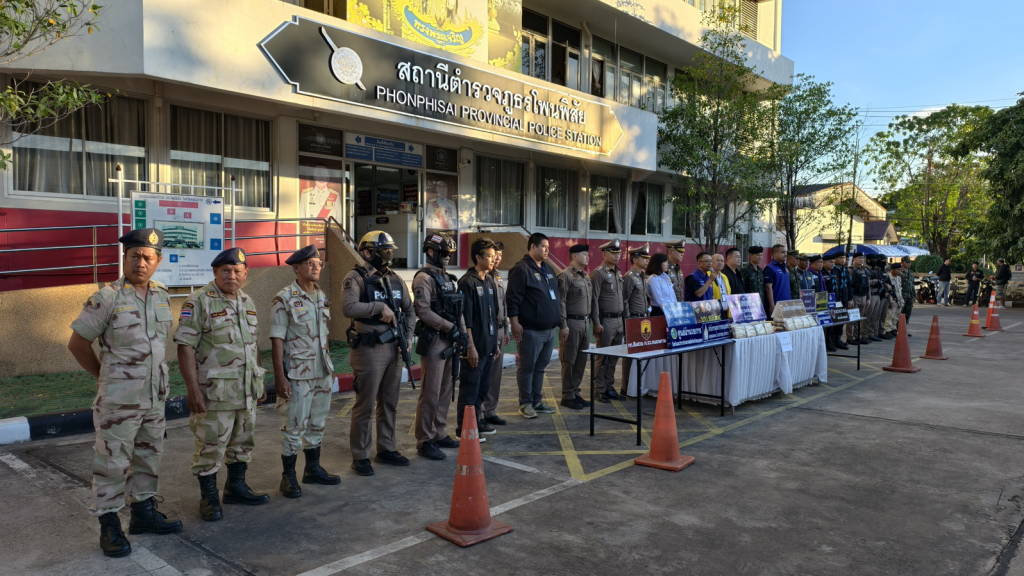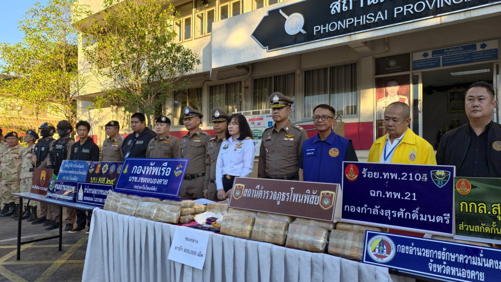 เมื่อเวลา 16.50 น.วันนี้ (17 ธ.ค. 68) ที่หน้า สภ.โพนพิสัย จ.หนองคาย นายประทีป อุ่ยเจริญ ปลัดจังหวัดหนองคาย , พล.ต.ต.อัทธชนม์ ช่วงงาม ผบก.ภ.จว.หนองคาย , พ.ต.อ.ประภาพ ธิติศักดิ์ รอง ผบก.ภ.จว.หนองคาย , พ.ต.อ.วิทยากรณ์ ษมากรวิทิต ผกก.สภ.โพนพิสัย , พันตรี วิทยา สิงห์อร ผบ.ร้อย ฉก.ทพ.2104 , นางสาววรรณา ผู้อุตส่าห์ นายด่านศุลกากรหนองคายปฏิบัติหน้าที่ ผู้อำนวยการสำนักงานศุลกากรหนองคาย , พ.ต.ท.สิทธิรักษ์ สิริสิงห์ รอง ผกก.ป.สภ.โพนพิสัย , ร.อ.ภาสพล สีทองเกตุ หน.หน่วยเรือโพนพิสัย , นายพลภัทร จันทร์ลุน ปลัดอำเภอโพนพิสัย ผู้แทนนายอำเภอโพนพิสัย , ร.ต.ไชโย หรพูน ผู้แทน บก.ควบคุมที่ 2 กกล.สุรศักดิ์มนตรี พร้อมเจ้าหน้าที่หน่วยงานความมั่นคงในพื้นที่ที่เกี่ยวข้อง ร่วมกันแถลงข่าวการตรวจยึดตรวจยึดยาบ้า จำนวน 4 แสนบาท เจ้าหน้าที่ สภ.โพนพิสัย ร่วมกับหน่วยงานความมั่นคงในพื้นที่ ตรวจยึดได้ที่บริเวณริมถนนสะพานห้วยหลวง ก่อนถึงทางเข้าหมู่บ้านข้องไก่ ม.5 ต.ชุมช้าง อ.โพนพิสัย จ.หนองคาย เมื่อเวลาประมาณ 05.20 น.วันนี้ (17 ธ.ค. 68)