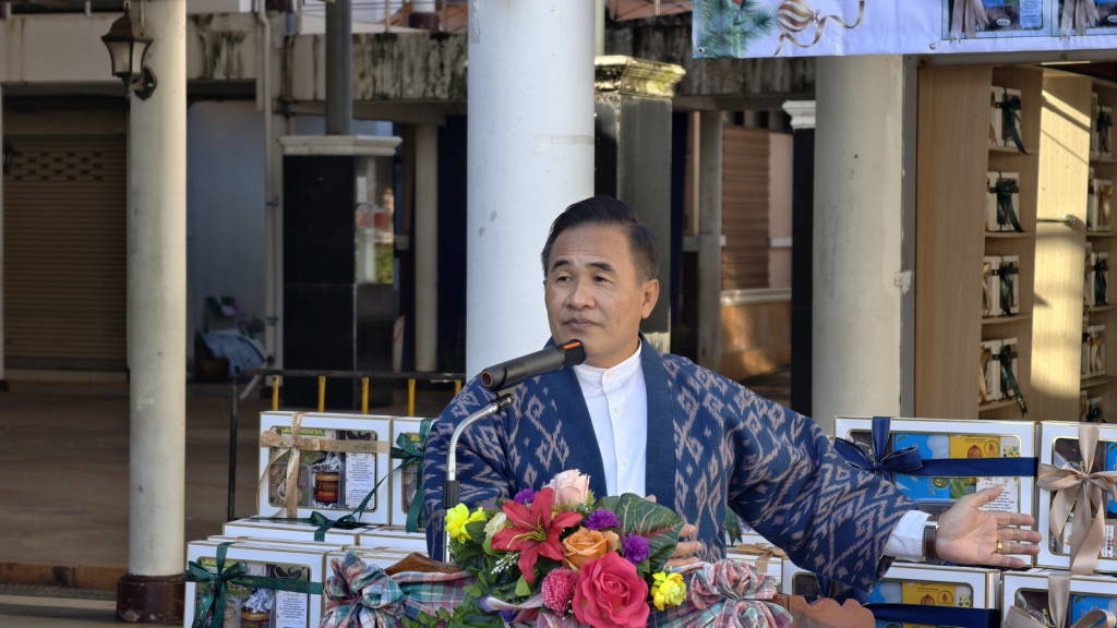 วันนี้ (25 ธ.ค. 68) ที่บริเวณลานหน้าร้านประชารัฐสามัคคีหนองคาย ภายในศูนย์ OTOP จังหวัดหนองคาย นายศรัณศักด์ ศรีเครือเนตร ผู้ว่าราชการจังหวัดหนองคาย เป็นประธานในพิธีส่งมอบกล่องของขวัญปีใหม่ ประจำปี 2569 จำนวน 550 ชุด คิดเป็นเงินกว่า 4 แสน ที่บริษัทในเครือเจียงอินเตอร์เนชั่นแนล จำกัด สั่งซื้อจากบริษัท ประชารัฐสามัคคีหนองคาย จำกัด โดยมีนายอนุชิต สกุลคู ประธานสภาอุตสาหกรรม / กรรมการบริหารกลุ่มธุรกิจอัศวรรณ ในเครือบริษัท เจียงอินเตอร์เนชั่นแนล จำกัด เป็นผู้รับมอบ มีนางมนนิภา โกวิทศิริกุล ประธานกรรมการ บริษัท ประชารัฐสามัคคีหนองคาย จำกัด กล่าวรายงาน