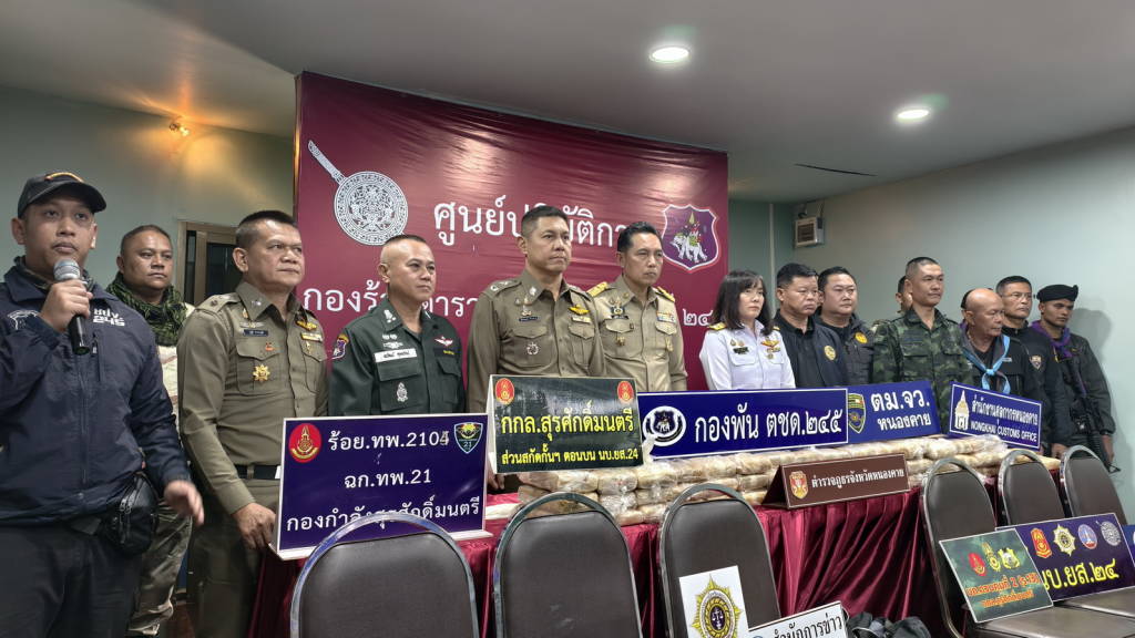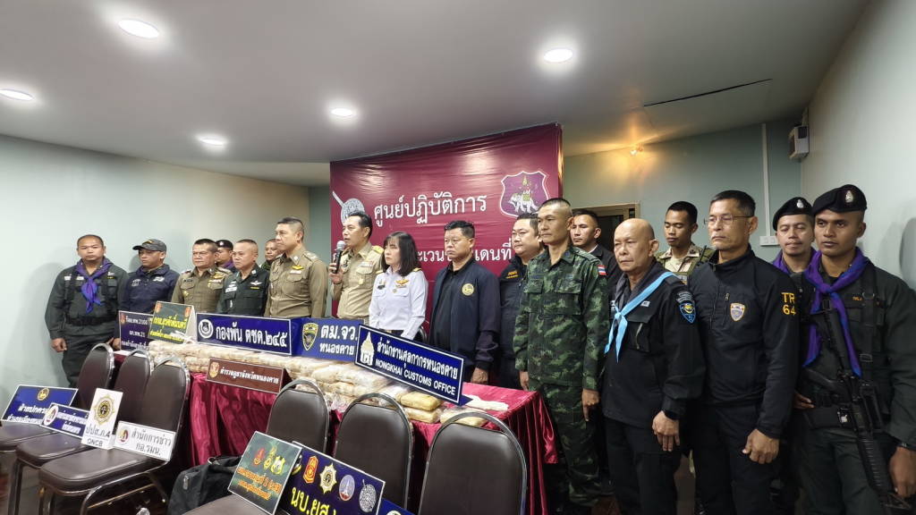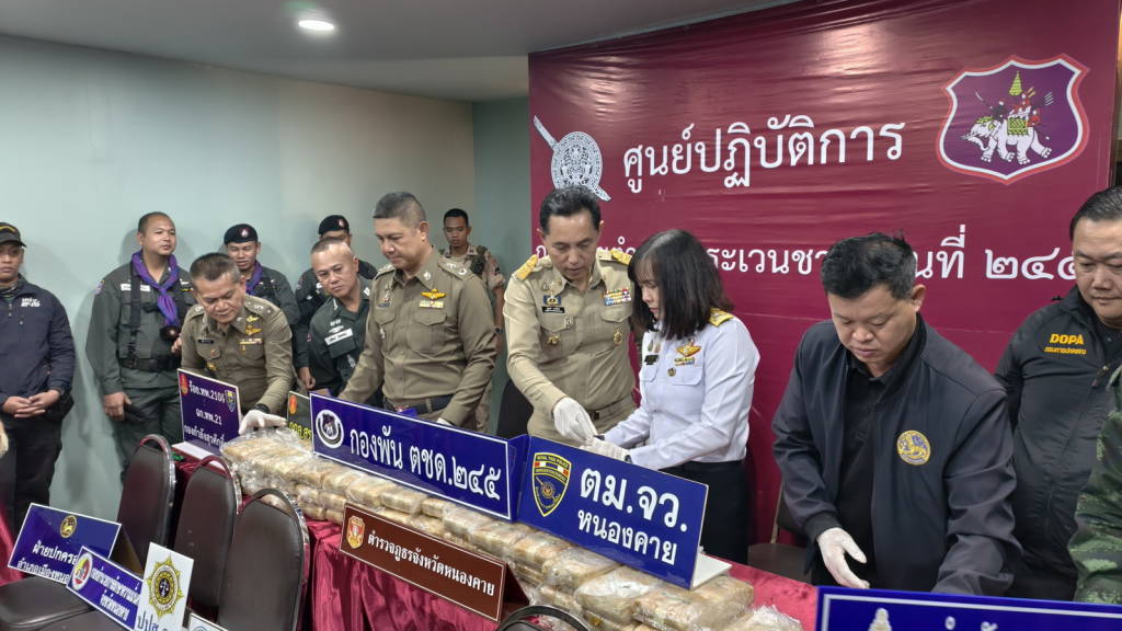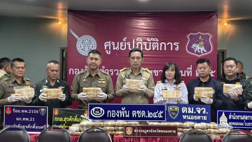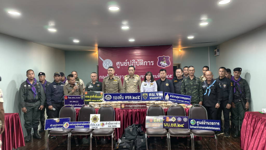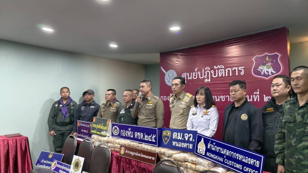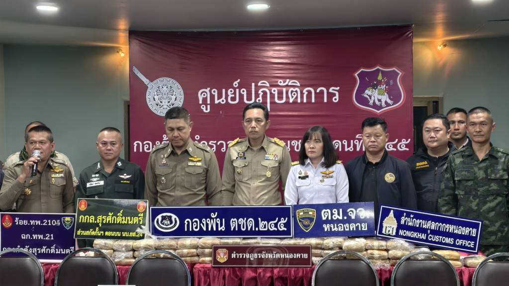 เมื่อเวลา 16.10 น.วันนี้ (12 ม.ค. 69) ณ กองร้อยตำรวจตระเวนชายแดนที่ 245 อ.เมืองหนองคาย จ.หนองคาย นายไพฑูรย์ มหาชื่นใจ รองผู้ว่าราชการจังหวัดหนองคาย , พล.ต.ต.อัทธชนม์ ช่วงงาม ผู้บังคับการตำรวจภูธรจังหวัดหนองคาย , พ.ต.อ.ณวัฒน์ ศุกลรัตน์ ผู้กำกับการกองกำกับการตำรวจตระเวนชายแดนที่ 24 , พ.ต.ท.ปฐวี ชำนาญดี รอง ผกก.ตชด.24 ทำหน้าที่ หัวหน้ากองร้อยตำรวจตระเวนชายแดนที่.245 , พ.ต.ท.ภานุวัฒน์ วงษ์วิจิตร ผู้บังคับกองร้อยตำรวจตระเวนชายแดนที่ 245 , พ.ต.วิทยา สิงห์อร ผู้บังคับกองร้อยเฉพาะกิจทหารพรานที่ 2104 , นางสาววรรณา ผู้อุตส่าห์ นายด่านศุลกากรหนองคาย ปฏิบัติหน้าที่ผู้อำนวยการสำนักงานศุลกากรหนองคาย , ว่าที่ ร.ต.อ.จันทร์เจ้า สุญาสิทธิ์ หัวหน้า ชุดปฏิบัติการข่าว ร้อย ตชด.245 , นายธวัชชัย กงเพชร หัวหน้ากลุ่มงานความมั่นคง อำเภอเมืองหนองคาย , นายชัยสิทธิ์ คำภาจันทร์ หัวหน้า ศูนย์อำนวยการป้องกันและปราบปรามยาเสพติดจังหวัดหนองคาย , ร.ต. ไชโย หรพูน ผู้แทน บก.ควบคุมที่ 2 กกล.สุรศักดิ์มนตรี , จ.ส.อ.ชัช ชวินทร์ ผู้แทน กอ.รมน.จังหวัด.นค. พร้อมหน่วยงานที่เกี่ยวข้อง ได้ร่วมกันแถลงข่าวการจับกุมนายพงค์พิพัฒน์ (ขอสงวนนามสกุล) ชาว อ.กระนวน จ.ขอนแก่น พร้อมยาบ้า จำนวน 299,000 เม็ด ที่เจ้าหน้าที่เจ้าหน้าที่ ตชด.245 ร่วมกับหน่วยกำลังที่เกี่ยวข้องจับกุมได้ที่ถนนหนองคาย-โพนพิสัย ช่วงทางแยกเข้าบ้านโคก บริเวณโคนเสาไฟฟ้าหลังศาลาทางหลวง ต.วัดหลวง อ.โพนพิสัย จว.หนองคาย ที่เวลา 03.00 น. ของวันนี้ (12 ม.ค. 69)