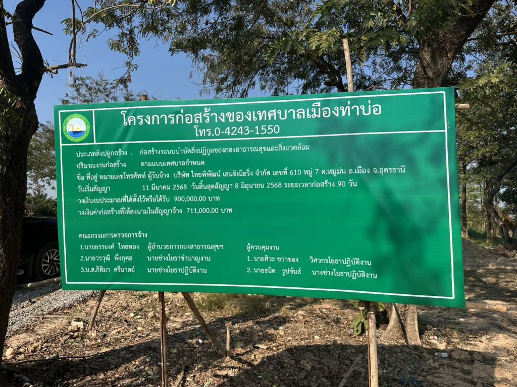 สำหรับโครงการดังกล่าว เป็นโครงการก่อสร้างของเทศบาลเมืองท่าบ่อ ประเภทสิ่งปลูกสร้าง ก่อสร้างระบบบำบัดสิ่งปฏิกูลของกองสาธารณสุขและสิ่งแวดล้อม ผู้รับจ้าง บริษัท ไทยพิพัฒน์ เอนจิเนียริ่ง จำกัด วันเริ่มสัญญา 11 มีนาคม 2568 วันสิ้นสุดสัญญา 8 มิถุนายน 2568 งบประมาณที่ตั้งไว้จำนวน 900,000 บาท วงเงินค่าก่อสร้างที่ได้ลงนามในสัญญาจ้าง 711,000 บาท
