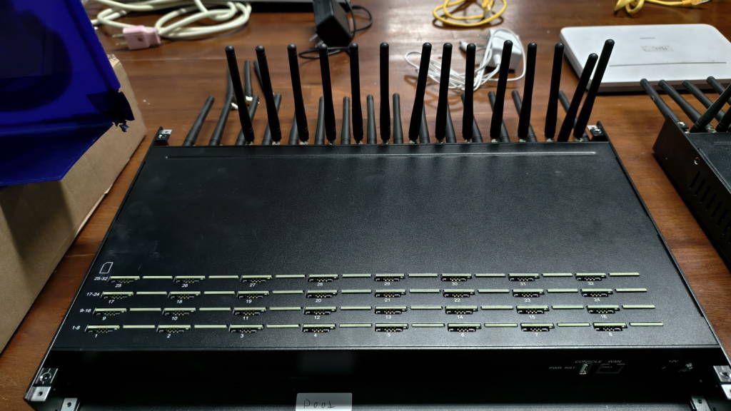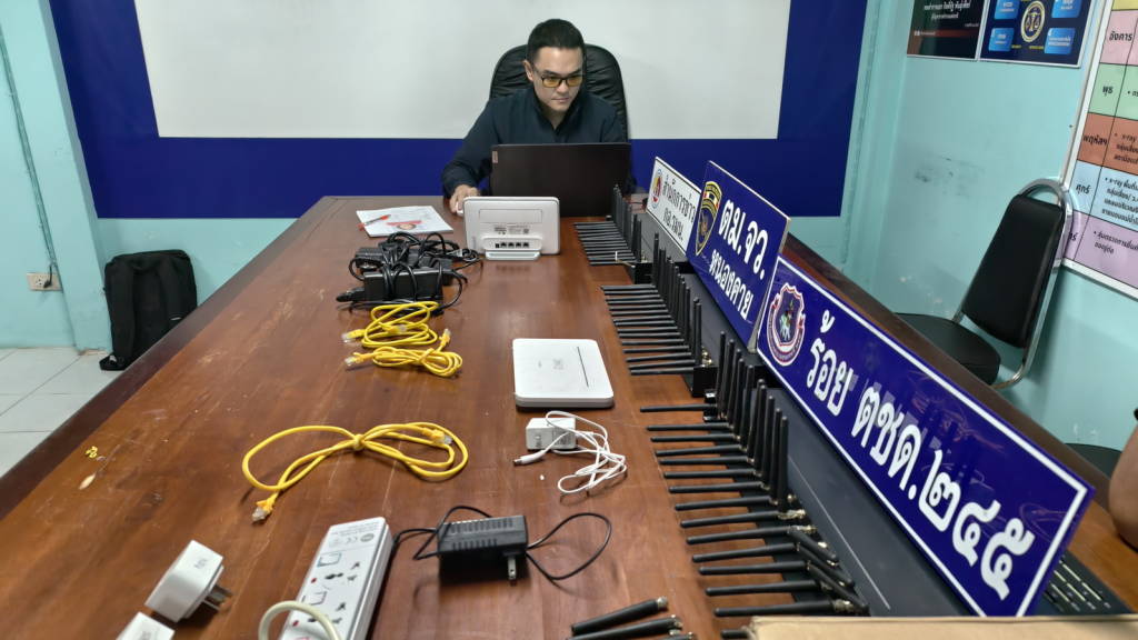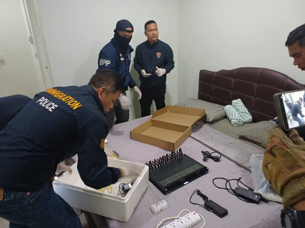 หลังได้รับแจ้ง พ.ต.ท.อภิชาติ คลธา สว.ตม.จว.หนองคาย พร้อมเจ้าหน้าที่ชุดสืบสวน ตม.หนองคาย ได้เดินทางไปตรวจสอบ โดยได้พบกับ นายวีระศักดิ์ (ขอสงวนนามสกุล) อายุ 66 ปี สัญชาติไทย ซึ่งเป็นเจ้าของรีสอร์ท และเป็นผู้ที่แจ้งข่าว นำการตรวจสอบที่ห้องหมายเลข 8 ซึ่งรีสอร์ทมีห้องพักทั้งหมด 8 ห้อง จากการเข้าตรวจสอบพบว่าภายในห้องพักไม่พบบุคคลที่เข้าพัก สภาพที่นอนเรียบร้อยยังไม่มีการใช้งาน โดยนายวีระศักดิ์ฯ แจ้งว่าสิ่งผิดปกติที่พบเห็นคือ ผู้เข้าพักได้มีการดัดแปลงสายไฟจากขึ้นไปยังฝ้าเพดานของห้อง เพื่อใช้ต่อหรือเชื่อมสายไฟกับอุปกรณ์ไฟฟ้า จึงได้ร่วมกันเปิดแผ่นฝ้าเพื่อตรวจสอบ จากการตรวจสอบอุปกรณ์ เครื่องซิมบ็อกซ์ (SIM BOX) จำนวน 3 เครื่อง แต่ละเครื่องสามารถใส่ซิมได้ถึง 32 ซิม เครื่องรับและกระจายสัญญาณอินเทอเน็ตแบบไร้สาย ยี่ห้อ HUAWEI จำนวน 2 เครื่อง พร้อมอุปกรณ์สาย adaptor จำนวน 3 ตัว และปลั๊กไฟพ่วง จำนวน 1 ตัว ซึ่งมีการต่อสายไฟเพื่อให้เครื่อง SIM BOX สามารถใช้งานได้ เบื้องต้นไม่มีผู้ใดมาแสดงตนเป็นเจ้าของ จึงได้ทำการตรวจยึดมาเพื่อทำการตรวจสอบ
