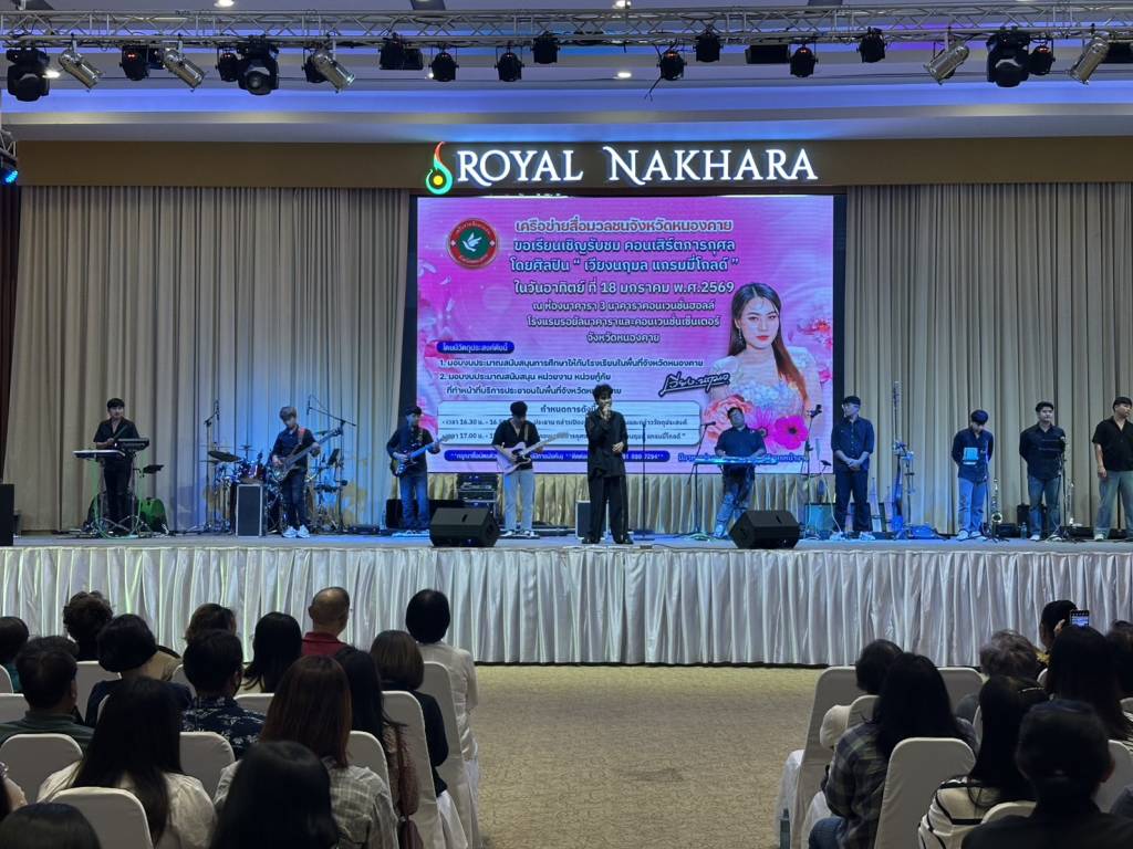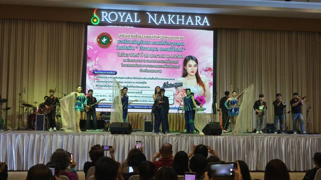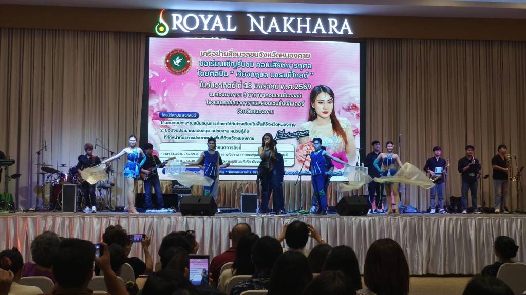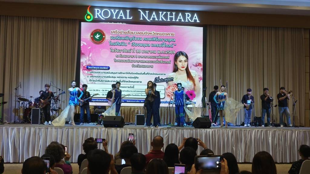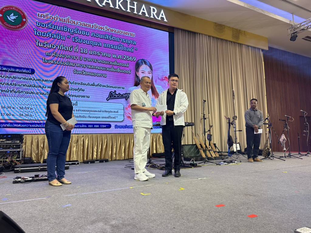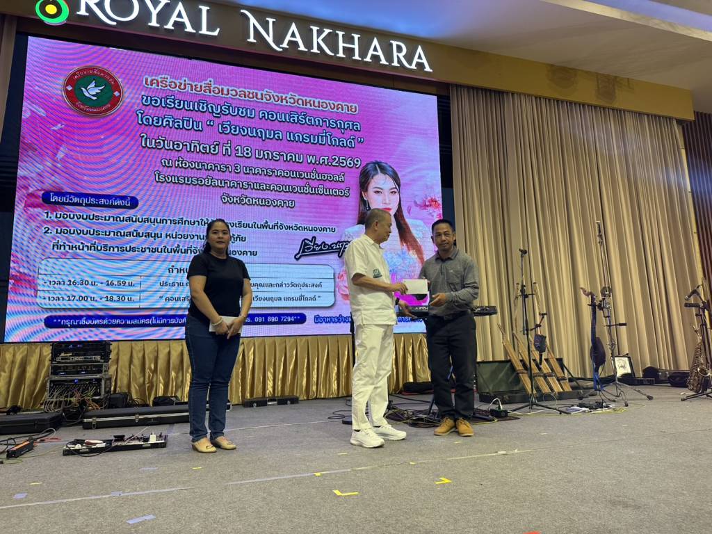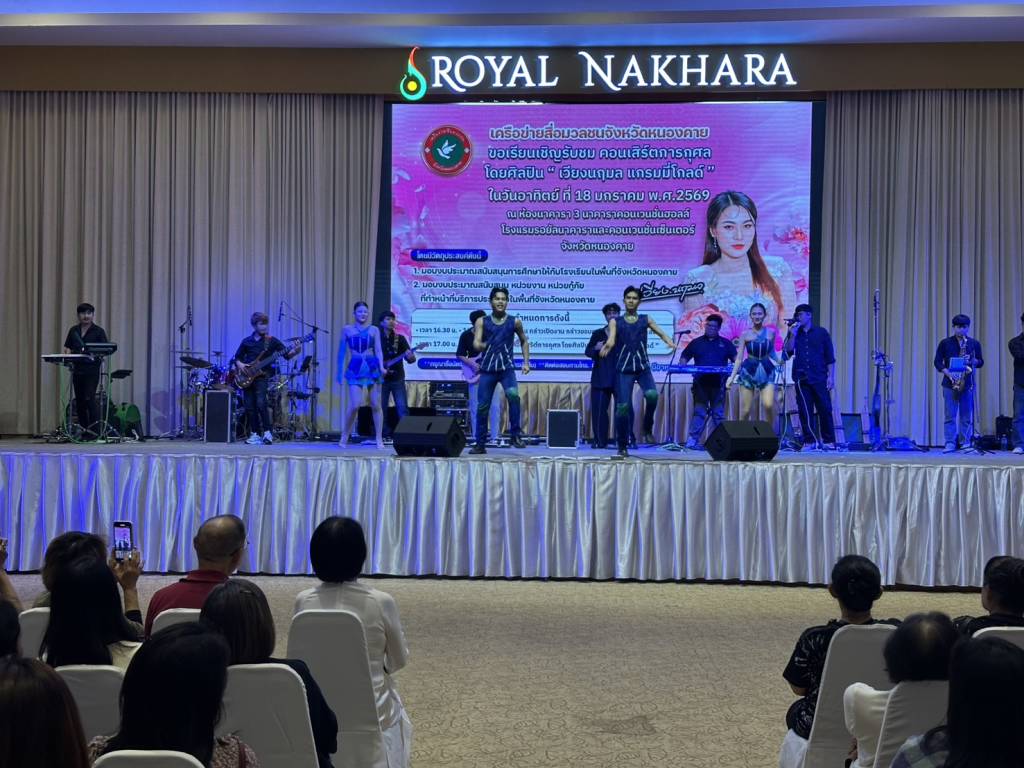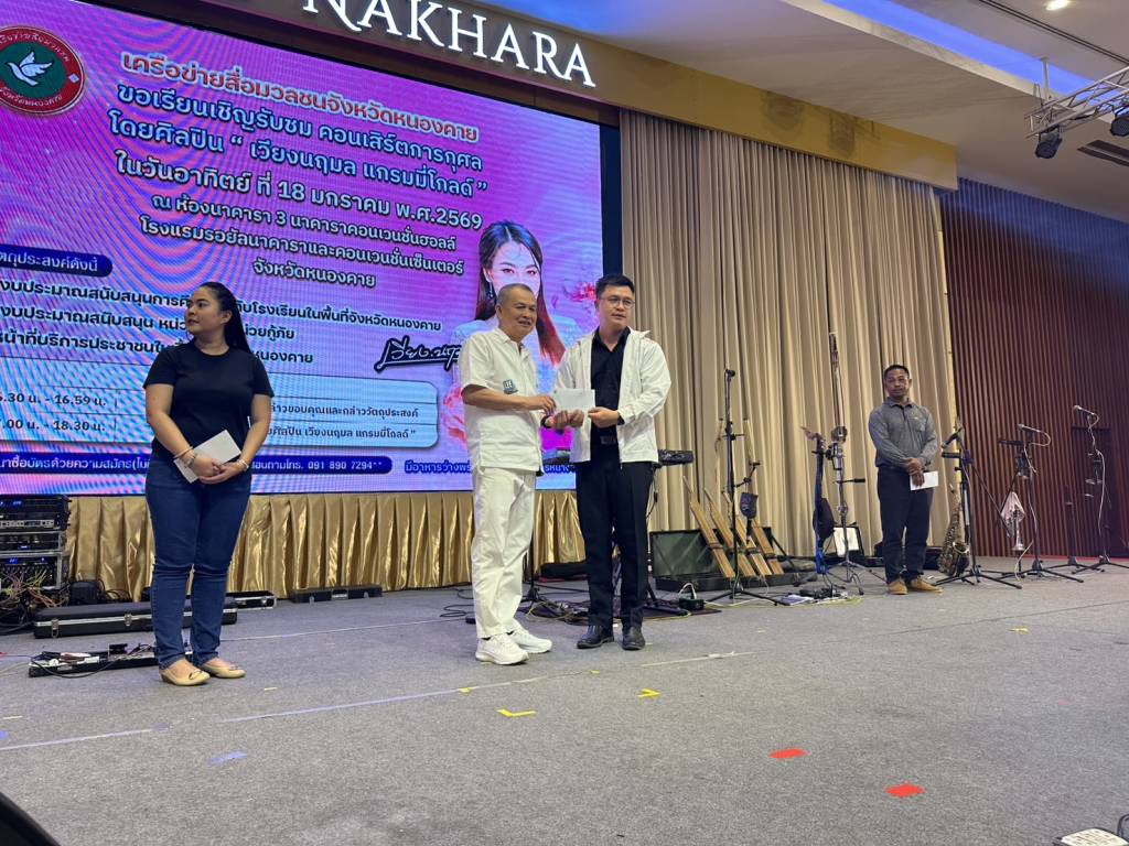 วันนี้ (18 ม.ค. 69) เวลา 17.00 น. ที่ห้องประชุมโรงแรมรอยัลนาคารา3 อ.เมืองหนองคาย จ.หนองคาย นายวีระชัย โชคมงคลภูมิรัตน์ รองนายกเทศมนตรีเมืองหนองคาย เป็นประธานเปิดกิจกรรมคอนเสิร์ตการกุศล “เวียง นฤมล” ศิลปินจากแกรมมี่โกลด์ พร้อมมอบเงินสนับสนับสนุนโรงเรียน หน่วยกู้ภัย (หน่วยกู้ภัยประจักษ์/หน่วยกู้ภัยร่วมใจอำเภอท่าบ่อ) ในพื้นที่จังหวัดหนองคาย โดยมี นายปราโมทย์ สุขสวัสดิ์ นายกเทศมนตรีตำบลวัดธาตุ/ประธานสันนิบาตเทศบาลจังหวัดหนองคาย ,นางมณีรัตน์ สุระขาย สมาชิกสภาเทศบาลเมืองหนองคาย ร่วมมอบ มี นายอภิรัตน์ชัย จอมศรี ผู้สื่อข่าวอาวุโสจังหวัดหนองคาย และที่ปรึกษาเครือข่ายสื่อมวลชนจังหวัดหนองคาย หัวหน้าส่วนราชการ ผู้บริหารองค์กรปกครองส่วนท้องถิ่น ผู้ประกอบการ ประชาชน ร่วมในพิธีจำนวนมาก