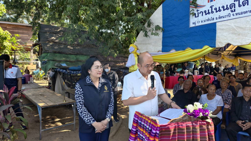 วันนี้ (20 ม.ค. 69) นายไพฑูรย์ มหาชื่นใจ รองผู้ว่าราชการจังหวัดหนองคาย เป็นประธานในพิธีมอบบ้านตาม โครงการ “บ้านกาชาดสร้างสุขจังหวัดหนองคาย เพื่อเฉลิมพระเกียรติ สมเด็จพระนางเจ้าสิริกิติ์ พระบรมราชินีนาถ พระบรมราชชนนีพันปีหลวง” ประจำปี 2568 ให้กับประชาชนผู้มีฐานะยากจนและมีความประพฤติดี ในพื้นที่ บ้านโนนดู่เหนือ หมู่ 11 ต.นาทับไฮ อ.รัตนวาปี จ.หนองคาย จำนวน 1 หลัง โดยมีนายกิติภูมิ ดวงพรม นายอำเภอรัตนวาปี กล่าวรายงาน มีนางฤดีวรรณ ศรีเครือเนตร นายกเหล่ากาชาดจังหวัดหนองคาย , นางวรรณวิไล กันเพ็ชร์ รองประธานชมรมแม่บ้านมหาดไทยจังหวัดหนองคาย , นางอ้อมขวัญ คงทัน ที่ปรึกษานายกเหล่ากาชาดจังหวัดหนองคาย , กรรมการและสมาชิกเหล่ากาชาดจังหวัดหนองคาย , หัวหน้าส่วนราชการ / หน่วยงาน กำนัน ผู้ใหญ่บ้าน ผู้นำชุมชน ชาวบ้าน และองค์กรปกครองส่วนท้องถิ่น เข้าร่วมในพิธีมอบบ้านฯในครั้งนี้ด้วย