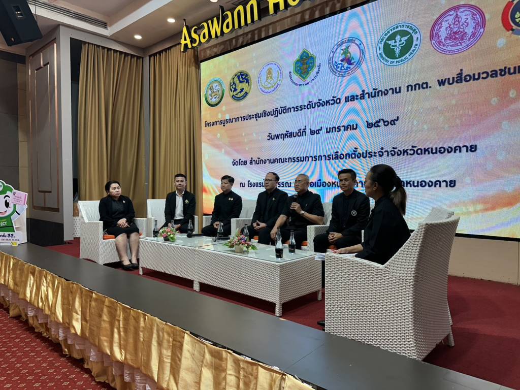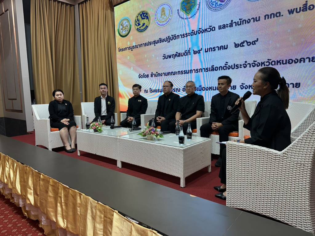 วันนี้ (29 ม.ค. 69) ณ โรงแรมอัศวรรณ อ.เมืองหนองคาย จ.หนองคาย นายศรัณศักด์ ศรีเครือเนตร ผู้ว่าราชการจังหวัดหนองคาย เป็นประธานในพิธีเปิดโครงการประชุมเชิงปฏิบัติการระดับจังหวัด และสำนักงาน กกต.พบสื่อมวลชนท้องถิ่น ที่สำนักงาน กกต.ประจำจังหวัดหนองคาย ร่วมกับสำนักงานประชาสัมพันธ์จังหวัดหนองคาย จัดให้มีขึ้น โดยมีนางสาวผจงลักษณ์ โสตศิริ ผู้อำนวยการสำนักงานคณะกรรมการการเลือกตั้งประจำจังหวัดหนองคาย กล่าวรายงาน หลังพิธีเปิดผู้ว่าราชการจังหวัดหนองคาย ยังได้ทดลองทำการเลือกตั้งทั้งการลงคะแนนเลือกตั้ง สส. และการออกเสียงประชามติ ที่หน่วยเลือกตั้งจำลอง ที่สำนักงาน กกต.ประจำจังหวัดหนองคาย ได้จัดเตรียมไว้ด้านหลังห้องประชุม