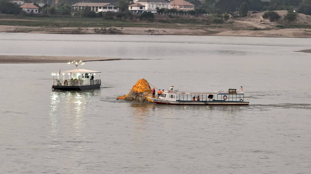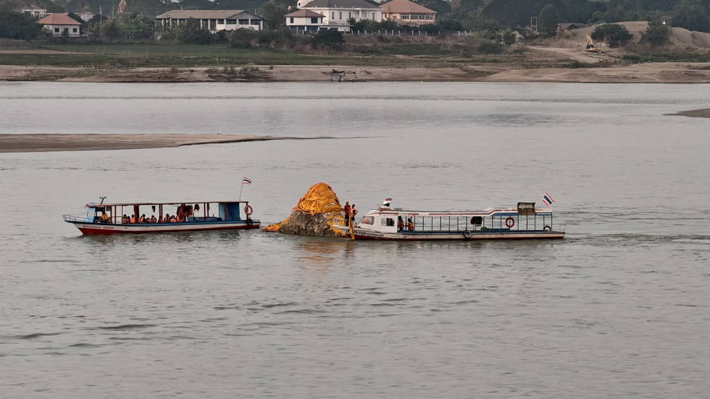 ขณะนี้ระดับน้ำในแม่น้ำโขงมีระดับต่ำ ทำให้ส่วนฐานองค์พระธาตุกลางน้ำโผล่พ้นน้ำกว่า 4 เมตร ให้พุทธศาสนิกชน ไทย-ลาวได้สักการะอย่างใกล้ชิด.