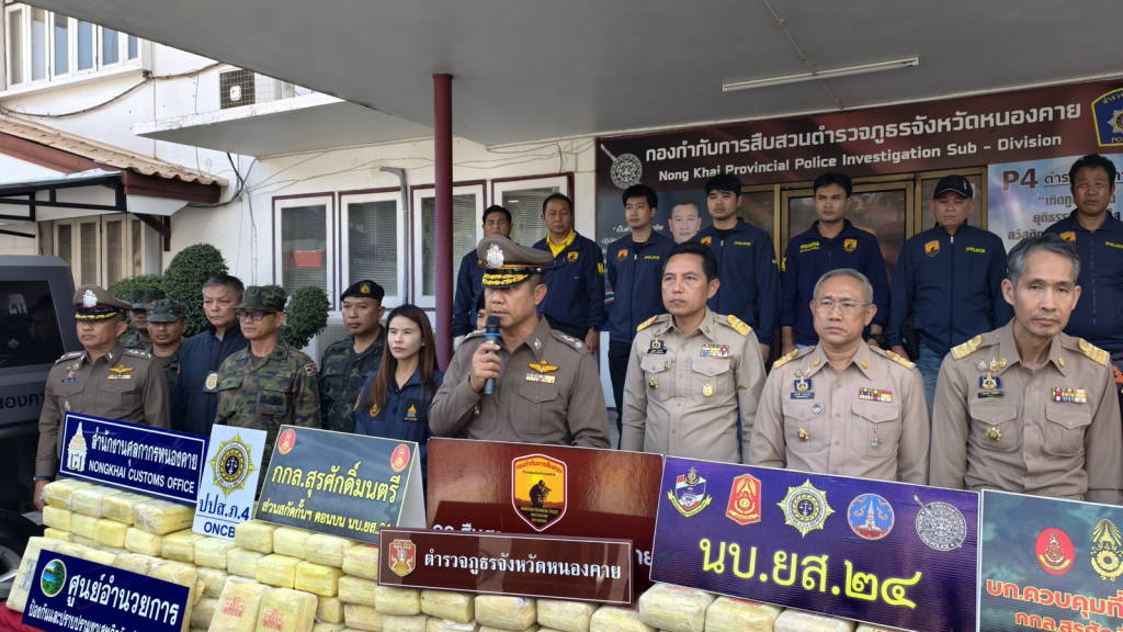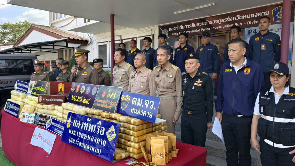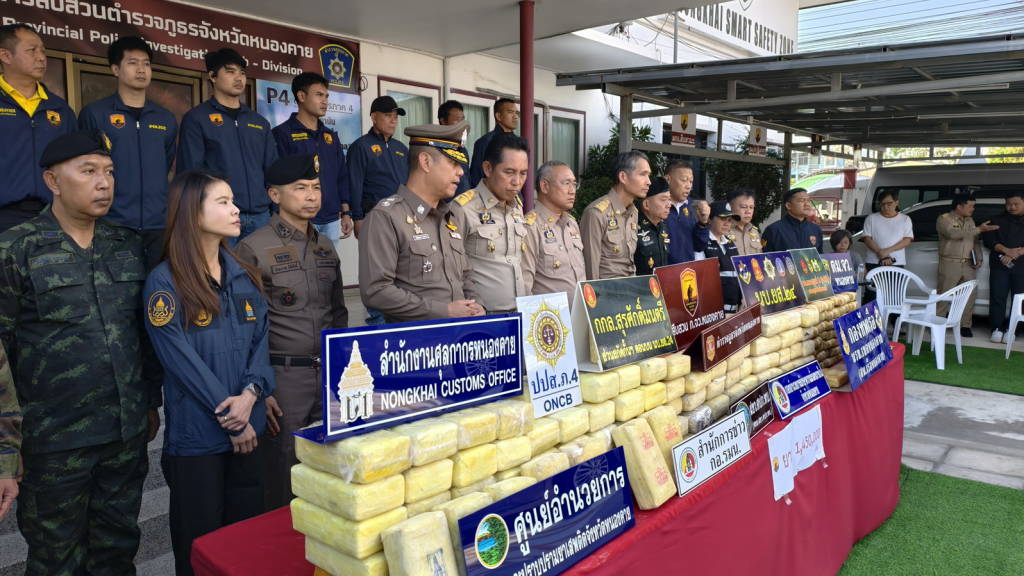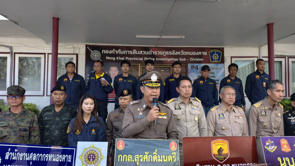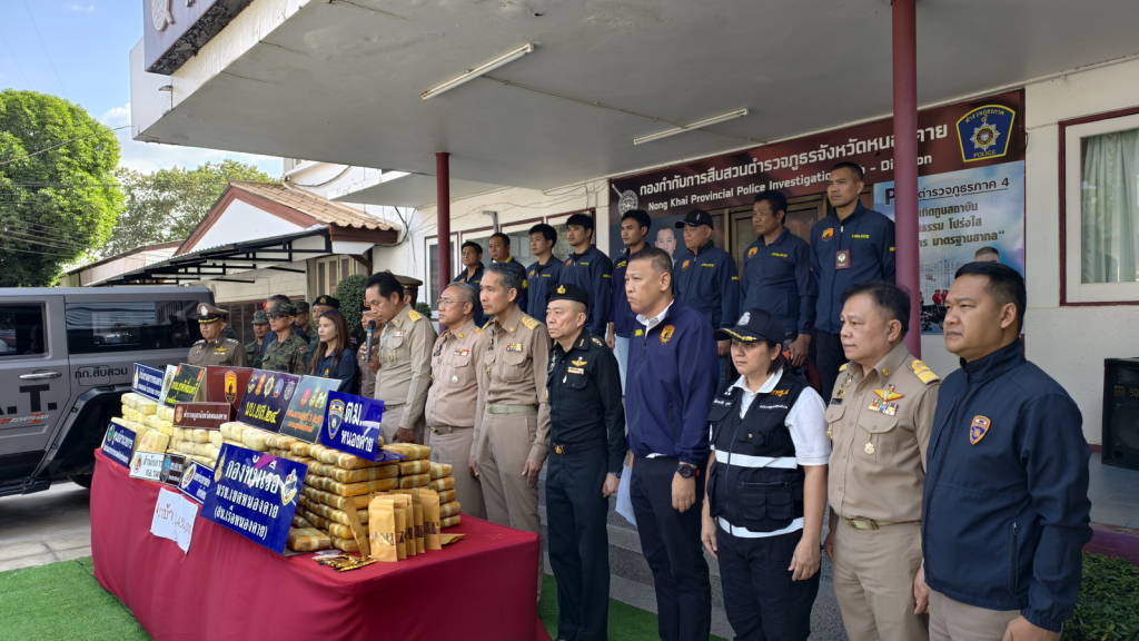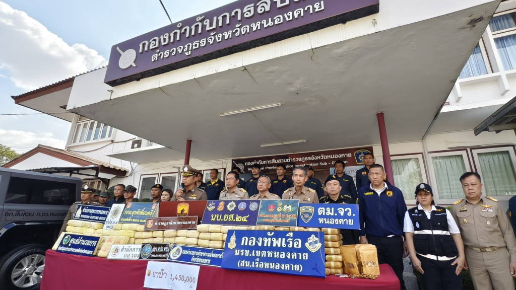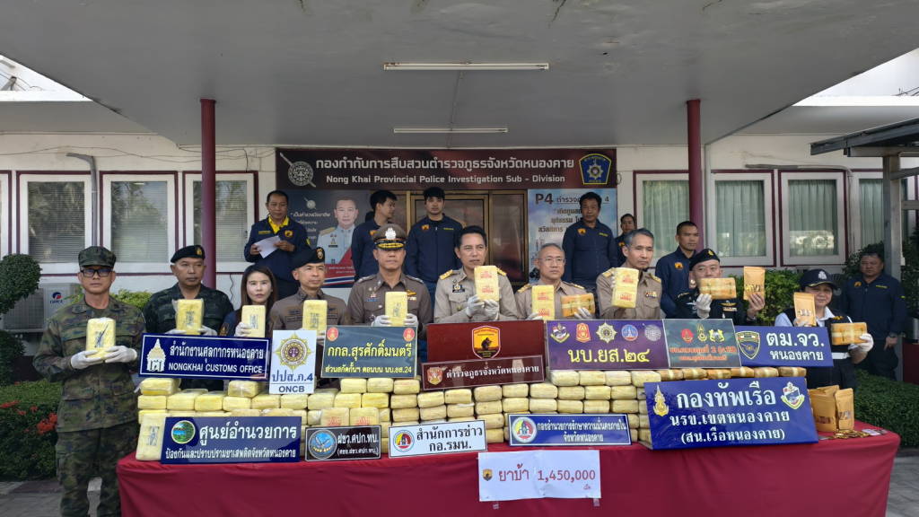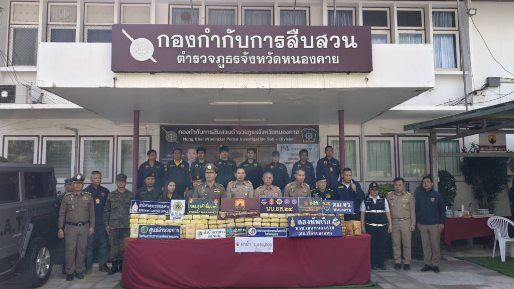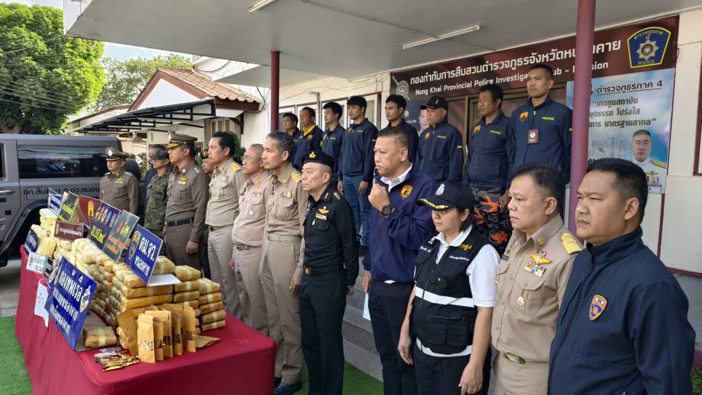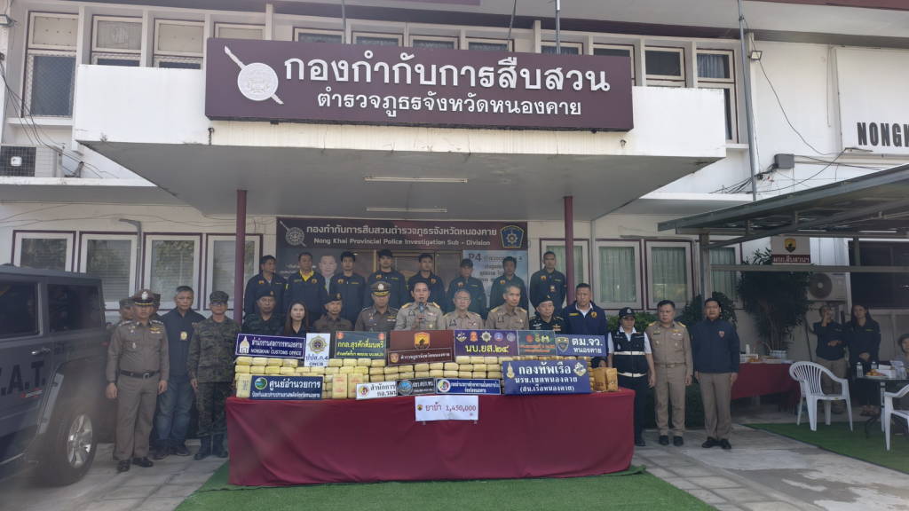 เมื่อเวลา 15.00 น.วันนี้ (2 ก.พ. 69) ที่ด้านหน้ากองกำกับการสืบสวน ตำรวจภูธรจังหวัดหนองคาย (กก.สส.ภ.จว.หนองคาย) นายไพฑูรย์ มหาชื่นใจ รองผู้ว่าราชการจังหวัดหนองคาย , พล.ต.ต.อัทธชนม์ ช่วงงาม ผบก.ภ.จว.หนองคาย , นายสุชาติ ทอนมณี ปลัดจังหวัดหนองคาย , พ.ต.อ.ประภาพ ธิติศักดิ์ รอง ผบก.ภ.จว.หนองคาย , พ.ต.อ.ศักดิ์สิทธิ์ บุเสริม ผกก.สืบสวน ภ.จว.หนองคาย ,พ.ต.อ.จิรวิทย์ ปานยิ้ม ผกก.สภ.เมืองหนองคาย , นายเดชมนตรี ผิวเหลือง ป้องกันจังหวัดหนองคาย , พ.อ.วีรเทพ การุณรอบดุล รอง ผอ.รมน.จังหวัดหนองคาย , พ.ต.ท.อภิชาติ คลธา สว.ตม.จว.หนองคาย , ผู้แทน ผบ.บก.ควบคุมที่2 (ร.13) กองกำลังสุรศักคิ์มนตรี , ผู้แทนนายด่านศุลกากรหนองคาย พร้อมหน่วยงานที่เกี่ยวข้อง ได้ร่วมกันแถลงข่าวการจับกุม นายเรวัต หรือออปโป้ อายุ 31 ปี ชาวจังหวัดหนองคาย และนายสหรัฐ หรือกอล์ฟ อายุ 26 ปี ชาวจังหวัดลพบุรี พร้อมยาบ้าประมาณ 1.45 ล้านเม็ด และพอตเคตามีน 120 อัน ที่เจ้าหน้าที่เจ้าหน้าที่ตำรวจ กก.สส.ภ.จว.หนอคาย ร่วมกับหน่วยงานที่เกี่ยวข้องจับกุมได้ ที่บริเวณป่าไม้ข้างทางท้ายหมู่บ้านบ้านโคกควงดี หมู่ 5 ต.หาคคำ อ.เมืองหนองคาย จ.หนองคาย เมื่อเวลาประมาณ 13.00 น.วันที่ 31 มกราคม 2569 ที่ผ่านมา