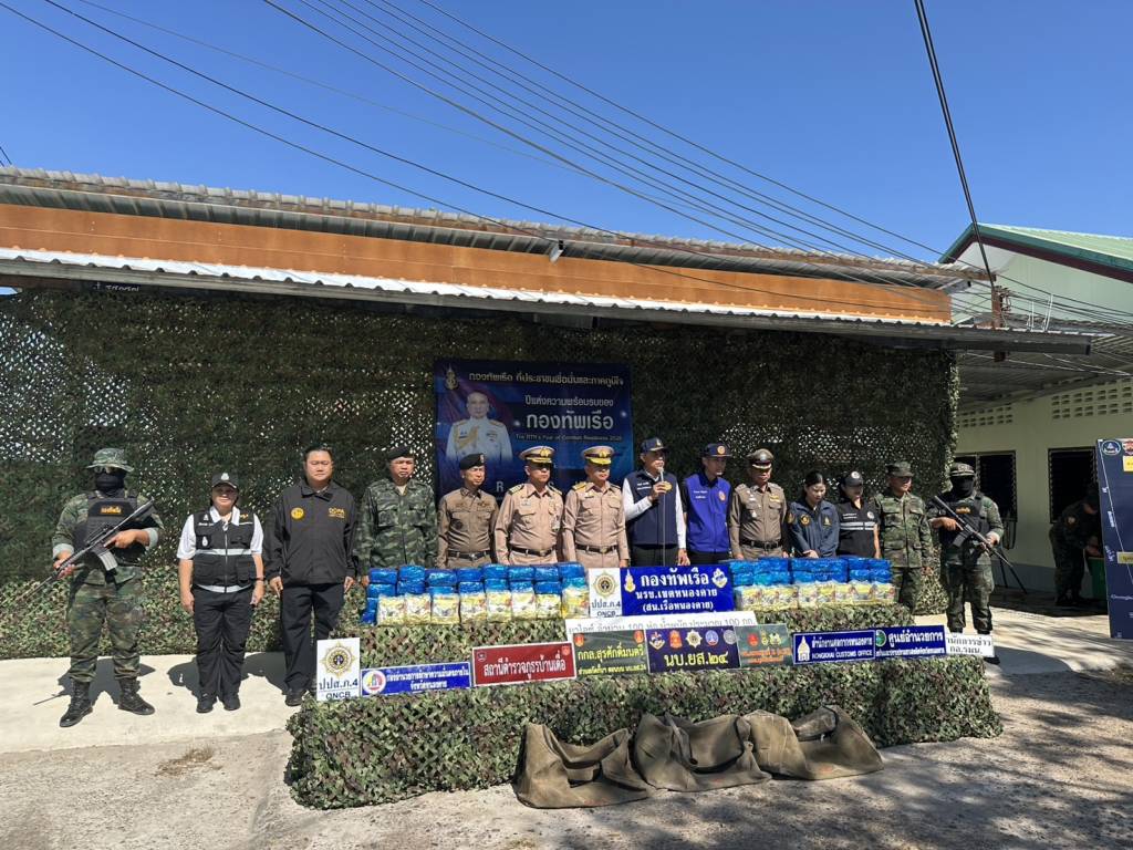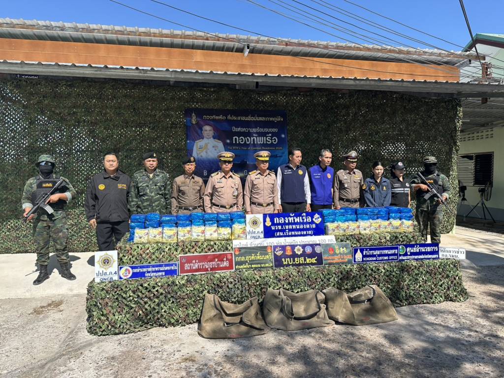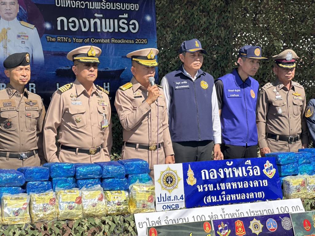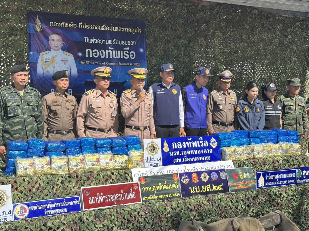 เมื่อเวลา 14.00 น.วันนี้ (3 ก.พ. 69) ที่สถานีหนองคาย อ.เมืองหนองคาย จ.หนองคาย นายไพฑูรย์ มหาชื่นใจ รองผู้ว่าราชการจังหวัดหนองคาย , พลเรือตรี ณรงค์ เอมดี ผบ.นรข. , น.อ.วิศิษฐ์พงศ์ เจริญวิชยเดช ผบ.นรข.เขตหนองคาย , น.ทอริยะ ทองมั่น หัวหน้าสถานีเรือหนองคาย , พ.ต.อ.ประภาพ ธิติศักดิ์ รอง ผบก.ภ.จว.หนองคาย , นายจักรพงศ์ พันธุ์เพ็ง นายอำเภอเมืองหนองคาย , พ.ต.อ.นวกฤต นวการพาณิชย์ ผกก.สภ.บ้านเดื่อ ,พ.ต.หญิง วิไลลักษณ์ มีชัยพิทักษ์สกุล แทน รอง ผอ.กอ.รมน.จังหวัดหนองคาย , ผู้แทนด่านศุลกากรหนองคาย , นายชัยสิทธิ์ คำภาจันทร์ หัวหน้าศูนย์อำนวยการป้องกันและปราบปรามยาเสพติดจังหวัดหนองคาย, ผู้แทน บก.ควบคุมที่ 2 กกล.สุรศักดิ์มนตรี พร้อมหน่วยงานที่เกี่ยวข้อง ได้ร่วมกันแถลงข่าวการตรวจยึดยาไอซ์ จำนวน 100 ห่อ น้ำหนักประมาณ 100 กก. ที่เจ้าหน้าที่ นรข.เขตหนองคาย (สถานีเรือหนองคาย) ร่วมกับหน่วยงานที่เกี่ยวข้องตรวจยึดได้ที่ริมฝั่งแม่น้ำโขง บริเวณบ้านหินโงม ต.หินโงม อ.เมืองหนองคาย จ.หนองคาย เมื่อเวลาประมาณ 21.00 น. วันที่ 1 กุมภาพันธ์ 2569 ที่ผ่านมา