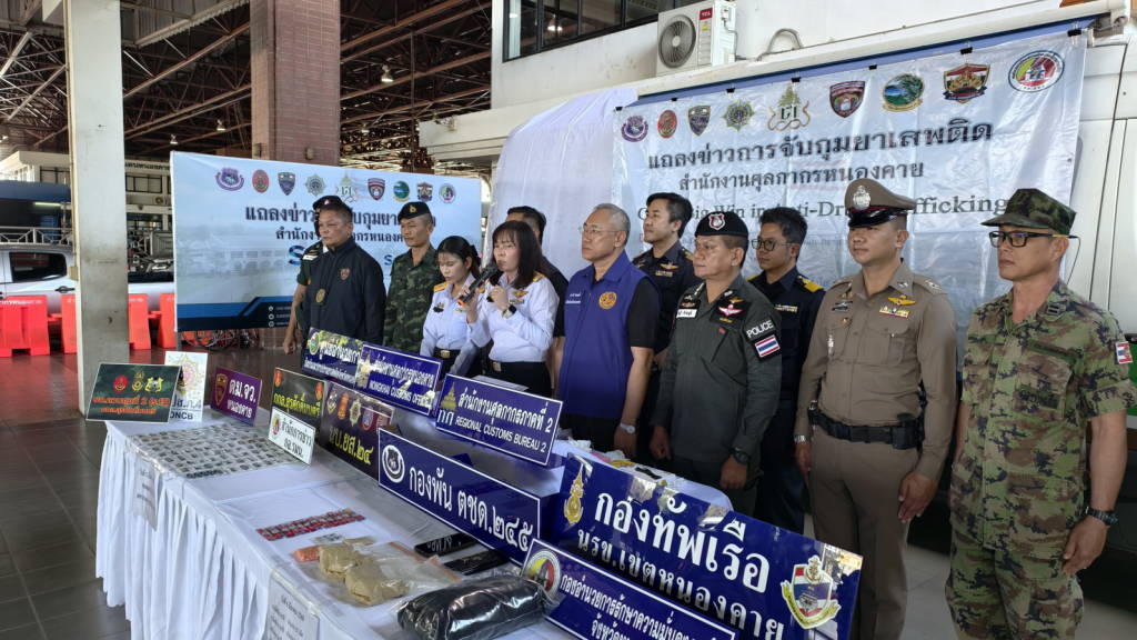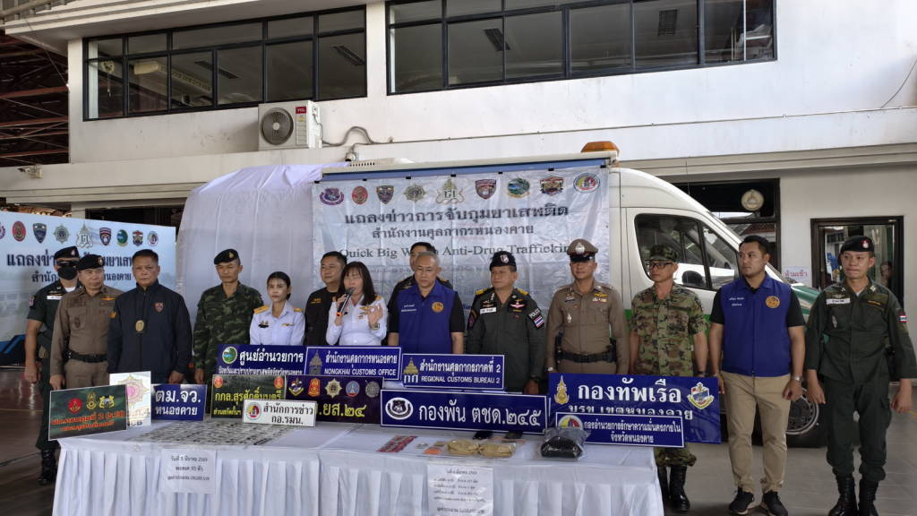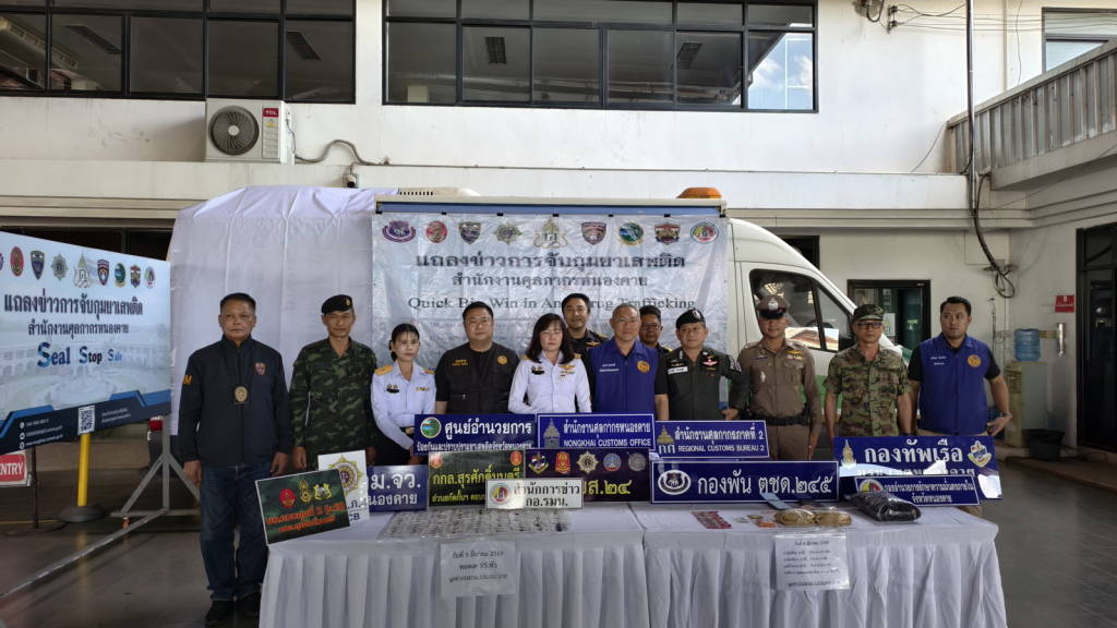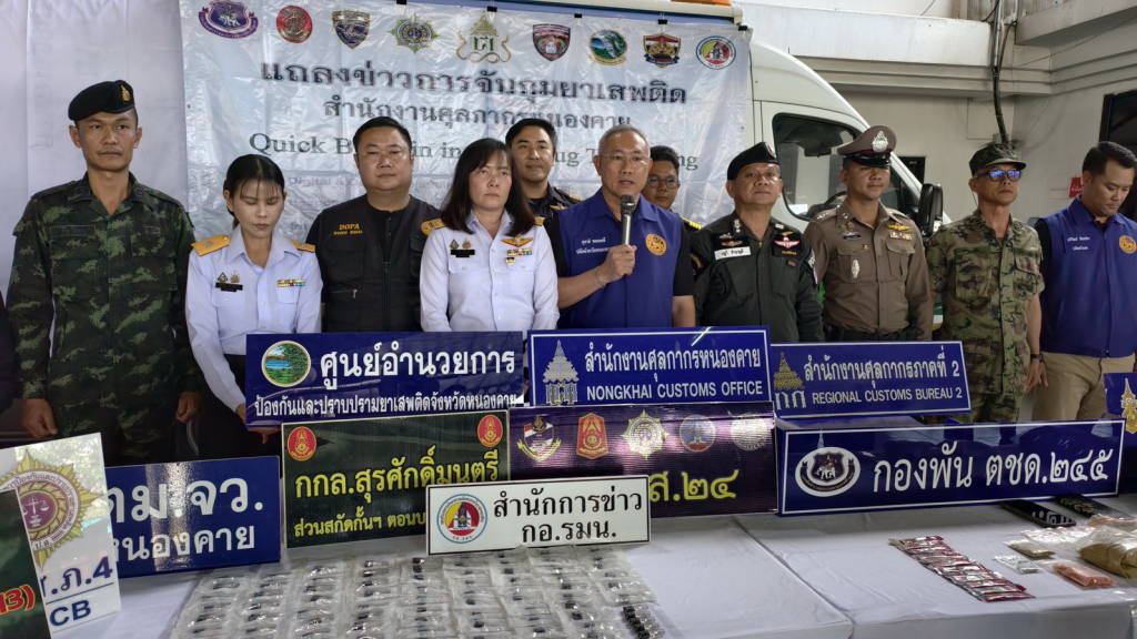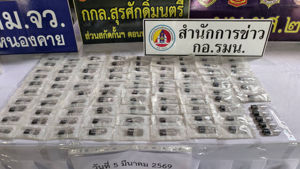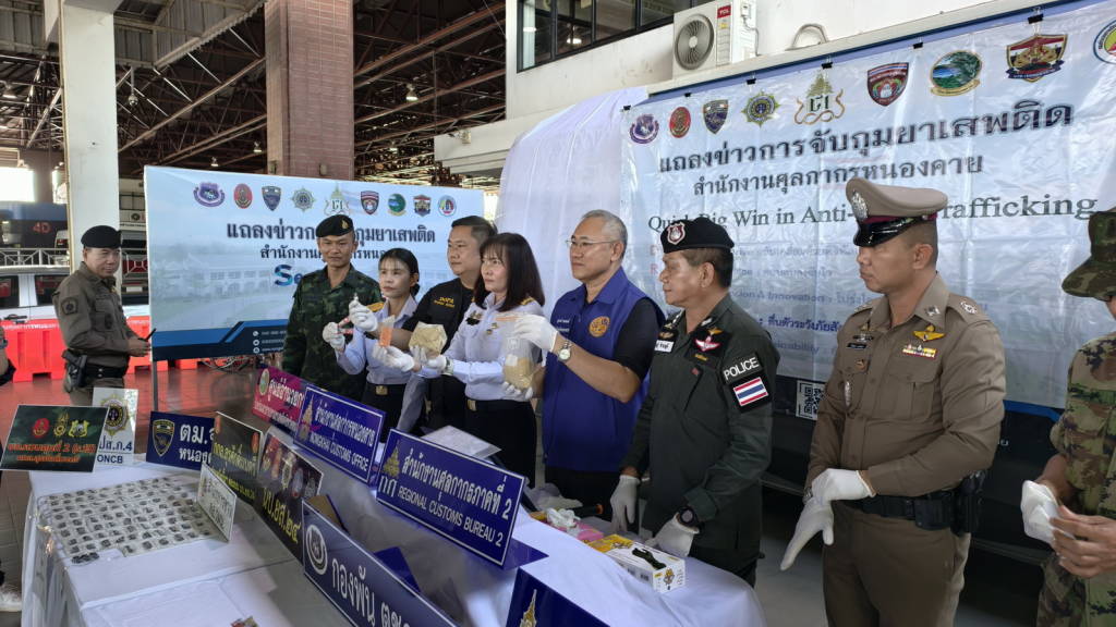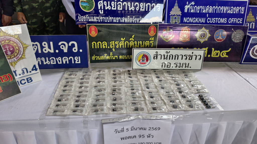 ส่วนอีกคดี เมื่อเวลาประมาณ 15.30 น. วันที่ 6 มีนาคม 2569 เจ้าหน้าที่ศุลกากรประจำด่านพรมแดนหนองคาย และเจ้าหน้าที่ฯ ฝ่ายสืบสวนและปราบปราม ร่วมกันตรวจสอบรถโดยสารระหว่างประเทศเวียงจันทน์ – อุดรธานี พบมีเสื้อคลุมสีดำที่มีลักษณะอาจมีของซุกซ่อนอยู่ภายใน วางอยู่บนที่นั่ง จึงได้สอบถามพนักงานขับรถโดยสารและผู้โดยสารที่นั่งอยู่บริเวณใกล้เคียง ทราบว่าเสื้อคลุมดังกล่าวเป็นของชายชาวจีน เจ้าหน้าที่จึงรออยู่จนกระทั่งพบชายชาวจีนคนดังกล่าวกลับมาที่นั่งและแสดงตนเป็นเจ้าของ จึงได้เชิญมาทำการตรวจสอบเสื้อคลุมดังกล่าวโดยละเอียด พบภายในเสื้อคลุมมียาอีลักษณะ เม็ดสีส้ม 257 เม็ด น้ำหนัก 54 กรัม , ยาอีลีกษณะ เม็ดสีม่วง 9 เม็ด น้ำหนัก 8 กรัม , แฮปปี้วอเตอร์ (Happy Water) จำนวน 12 ซอง น้ำหนัก 48 กรัม และผงสีน้ำตาล(ยาอี) 2 ถุงใหญ่ 1 ถุงเล็ก น้ำหนักรวม 803 กรัม ซุกซ่อนอยู่ รวมมูลค่าโดยประมาณ 5,018,600 บาท