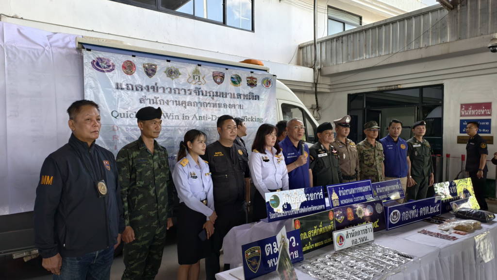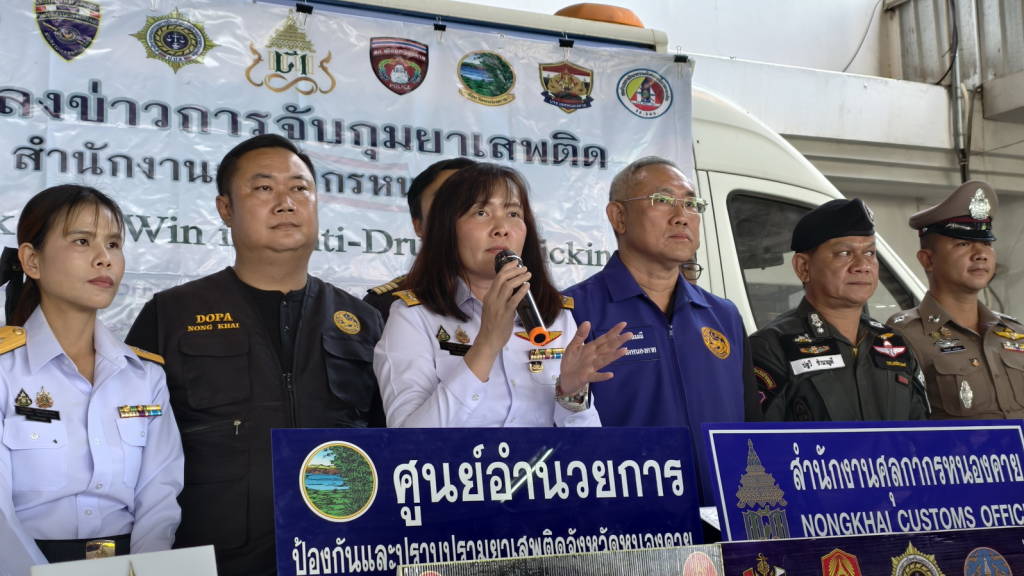 เมื่อเวลา 15.00 น.วันนี้ (7 มีค. 69) ที่ด่านพรมแดนสะพานมิตรภาพไทย-ลาว แห่งที่ 1 จังหวัดหนองคาย หรือด่านพรมแดนหนองคาย อ.เมืองหนองคาย จ.หนองคาย นายสุชาติ ทอนมณี ปลัดจังหวัดหนองคาย , นางสาววรรณา ผู้อุตส่าห์ นายด่านศุลกากรหนองคาย ปฏิบัติหน้าที่ ผอ.ศุลกากรหนองคาย , นายพัฒนพงศ์ ตันติวัฒนกุลชัย หัวหน้าฝ่ายบริการศุลกากรที่ 1 , ร.ต.ไชโย หรพูน ผู้แทน บก.ควบคุมที่ 2 กกล.สุรศักดิ์มนตรี , ตม.หนองคาย , นรข.หนองคาย พร้อมหน่วยงานที่เกี่ยวข้อง ได้ร่วมกันแถลงข่าวการจับกุมยาเสพติดจำนวน 2 คดี คดีแรกจับกุม นายธีรวัจน์ (ขอสงวนนามสกุล) อายุ 22 ปี ชาว ต.บ้านเลื่อม อ.เมือง จ.อุดรฯ พร้อมของกลางพอตเค (เคตามีน) พันรอบเอว จำนวน 95 หัว มูลค่ากว่า 1.9 แสนบาท ที่ซุกซ่อนโดยใช้เทปพันไว้รอบเอว ซึ่งเจ้าหน้าที่ฯจับกุมได้ที่ด่านพรมแดนหนองคาย เวลาประมาณ 19.20 น. วันที่ 5 มีนาคม 2569 ที่ผ่านมา อีกคดีจับกุมหนุ่มชาวจีน อายุ 27 ปี พร้อมของกลาง ยาอีลักษณะ เม็ดสีส้ม 257 เม็ด น้ำหนัก 54 กรัม , ยาอีลีกษณะ เม็ดสีม่วง 9 เม็ด น้ำหนัก 8 กรัม , แฮปปี้วอเตอร์ (Happy Water) จำนวน 12 ซอง น้ำหนัก 48 กรัม และผงสีน้ำตาล(ยาอี) 2 ถุงใหญ่ 1 ถุงเล็ก น้ำหนักรวม 803 กรัม มูลค่าโดยประมาณ 5,018,600 บาท ซึ่งเจ้าหน้าที่ฯจับกุมได้ที่ด่านพรมแดนหนองคาย เวลาประมาณ 15.30 น. วันที่ 6 มีนาคม 2569