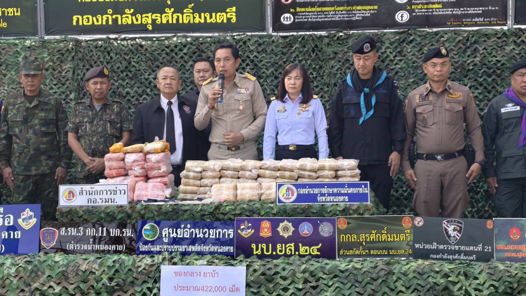 กองร้อยเฉพาะกิจทหารพรานที่ 2104 หน่วยเฉพาะกิจทหารพรานที่ 21 ร่วมกับหลายหน่วยงาน ตรวจยึดยาบ้าจำนวน 4.22 แสนเม็ด ที่ริมฝั่งแม่น้ำโขงพื้นที่บ้านถิ่นดุง ซอย 3 หมู่ 10 ต.วัดหลวง อ.โพนพิสัย จ.หนองคาย