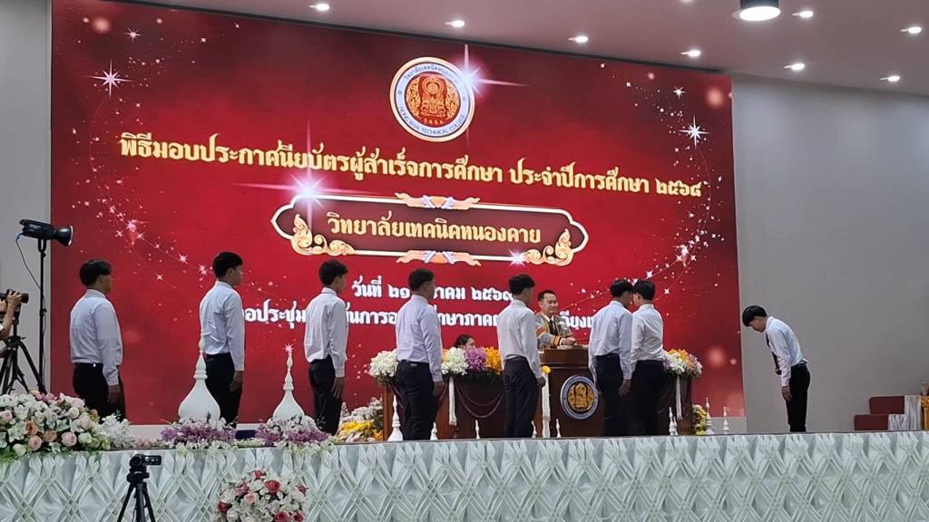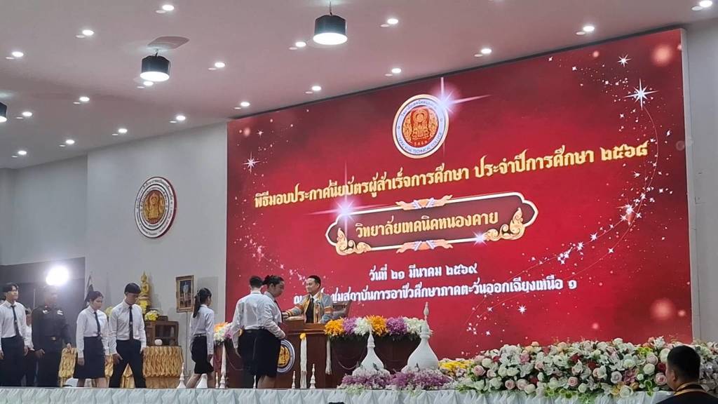 วันที่ 21 มีนาคม 2569 เวลา 09.00 น. ณ หอประชุมสถาบันการอาชีวศึกษาภาคตะวันออกเฉียงเหนือ วิทยาลัยเทคนิคหนองคาย 2 อ.เมืองหนองคาย จ.หนองคาย นายสง่า แต่เชื้อสาย รองเลขาธิการคณะกรรมการการอาชีวศึกษา เป็นประธานมอบประกาศนียบัตรผู้สำเร็จการศึกษา ประจำปีการศึกษา 2568 ที่สำนักงานอาชีวศึกษาจังหวัดหนองคายได้จัดขึ้น