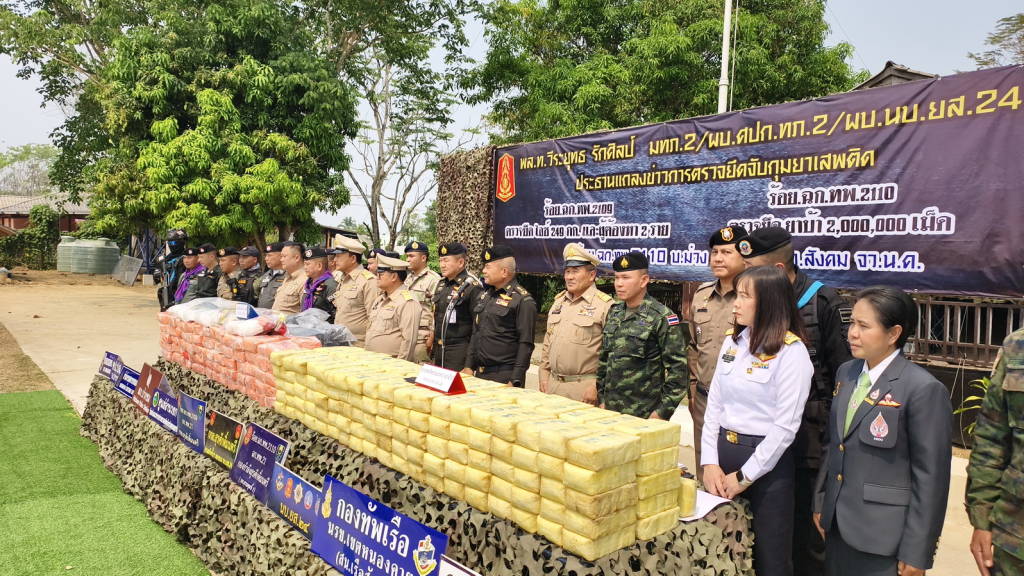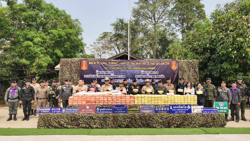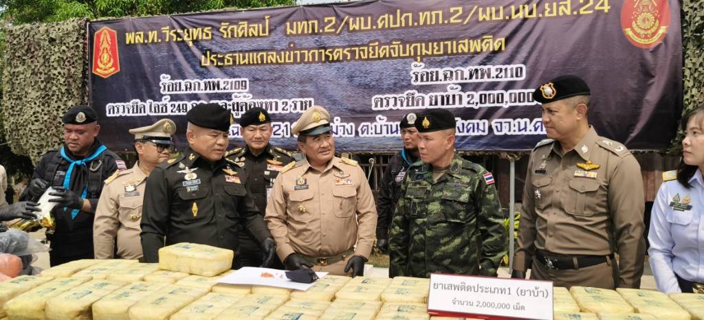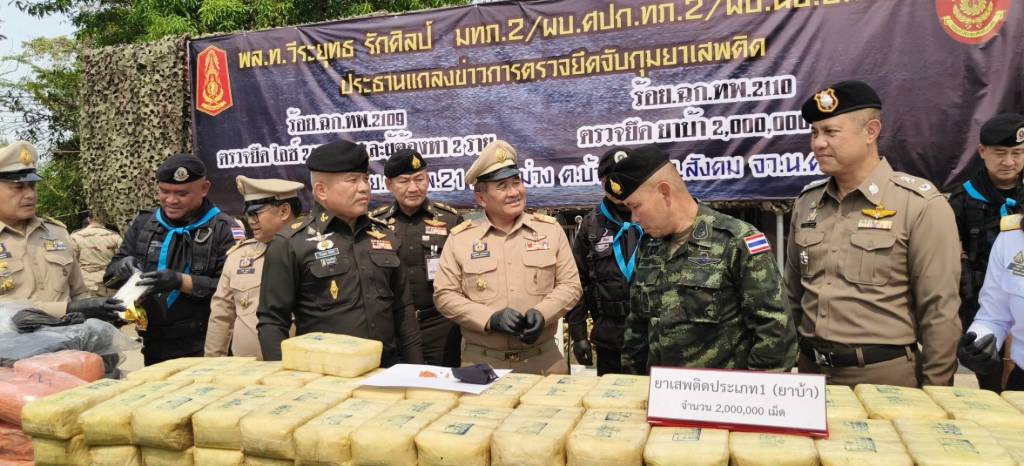 แม่ทัพภาคที่ 2 เป็นประธานการแถลงข่าวกองร้อยเฉพาะกิจทหารพรานที่ 2110 หน่วยเฉพาะกิจทหารพรานที่ 21 ตำบลบ้านม่วง อำเภอสังคม จังหวัดหนองคาย บูรณาการร่วมกับหลายหน่วยงานตรวจยึดยาบ้าริมฝั่งแม่น้ำโขงจำนวน 2 ล้านเม็ด มูลค่ากว่า 60 ล้านบาท และกองร้อยเฉพาะกิจทหารพรานที่ 2109 อ.ปากชม จังหวัดเลย ร่วมกับหลายหน่วยงาน ตรวจยึดไอซ์ 249 กิโลกรัม มูลค่ากว่า 35 ล้านบาท พร้อมผู้ต้องหา 2 ราย พบเชื่อมโยงกับเครือข่ายยาบ้า 2 ล้านเม็ด