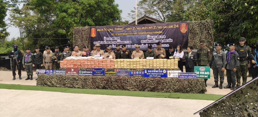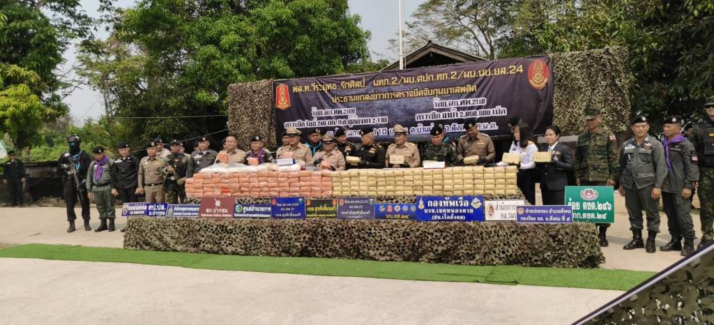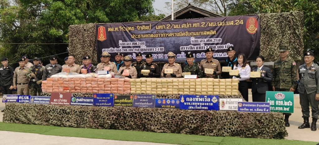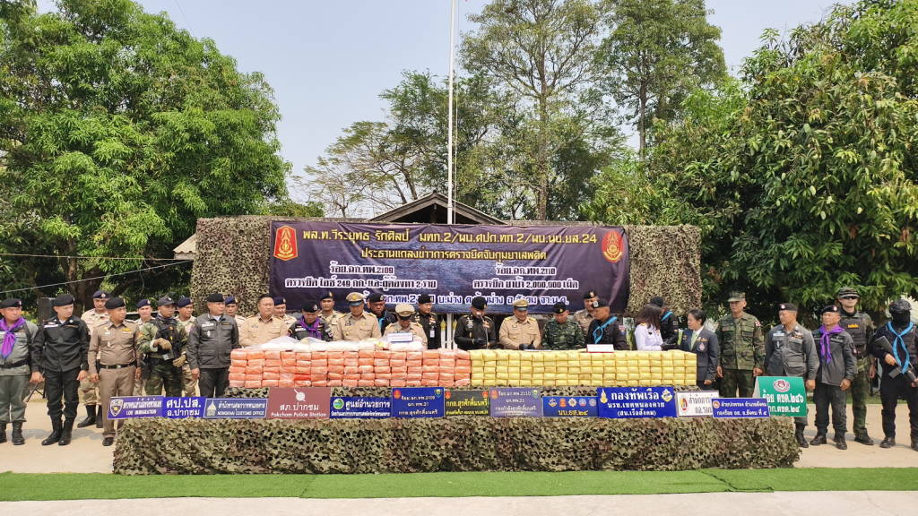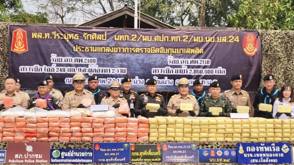 คดีที่ 2 กองร้อยเฉพาะกิจทหารพรานที่ 2109 อ.ปากชม จ.เลย (หน่วยงานหลัก) ร่วมกับฝ่ายปกครอง และตำรวจ สภ.ปากชม จับกุมผู้ต้องหา 2 ราย คือ นายจิตวัต อายุ 31 ปี ชาวจังหวัดหนองคาย และนายจิตรภาณุ อายุ 35 ปี ชาวจังหวัดหนองคาย พร้อมไอซ์ 249 กิโลกรัม มูลค่ากว่า 35 ล้านบาท ที่บริเวณป่าสักริมน้ำโขง บ้านปากเนียม ต.ห้วยพิชัย อ.ปากชม จ.เลย เมื่อเวลาประมาณ 04.45 น. วันที่ 28 มีนาคม 2569 ที่ผ่านมา โดยกองร้อยเฉพาะกิจทหารพรานที่ 2109 ตรวจพบรถยนต์ต้องสงสัยเข้ามาจอดบริเวณริมแม่น้ำโขง บ.ปากเนียม ม.5 ต.ปากเนียม อ.ปากชม จว.ล.ย. พบบุคคลได้ลำเลียงวัตถุบางอย่างขึ้นบนรถยนต์ต้องสงสัย และขับรถยนต์ตามเส้นทางหมายเลข 211 มุ่งหน้าไปยังจังหวัดหนองคาย จากนั้นเจ้าหน้าที่ประสานหน่วยงานในพื้นที่สกัดกั้นรถยนต์คันดังกล่าว ไล่ติดตามจนกระทั่งรถยนต์เกิดเสียหลักลงข้างทาง จึงได้ควบคุมตัวผู้ต้องหาทั้งสองคนไว้ได้ พร้อมยาไอซ์ที่ซุกซ่อนมาในรถ ซึ่งตรวจสอบพบว่าเชื่อมโยงกับเครือข่ายยาบ้า 2 ล้านเม็ด (คดีแรก).