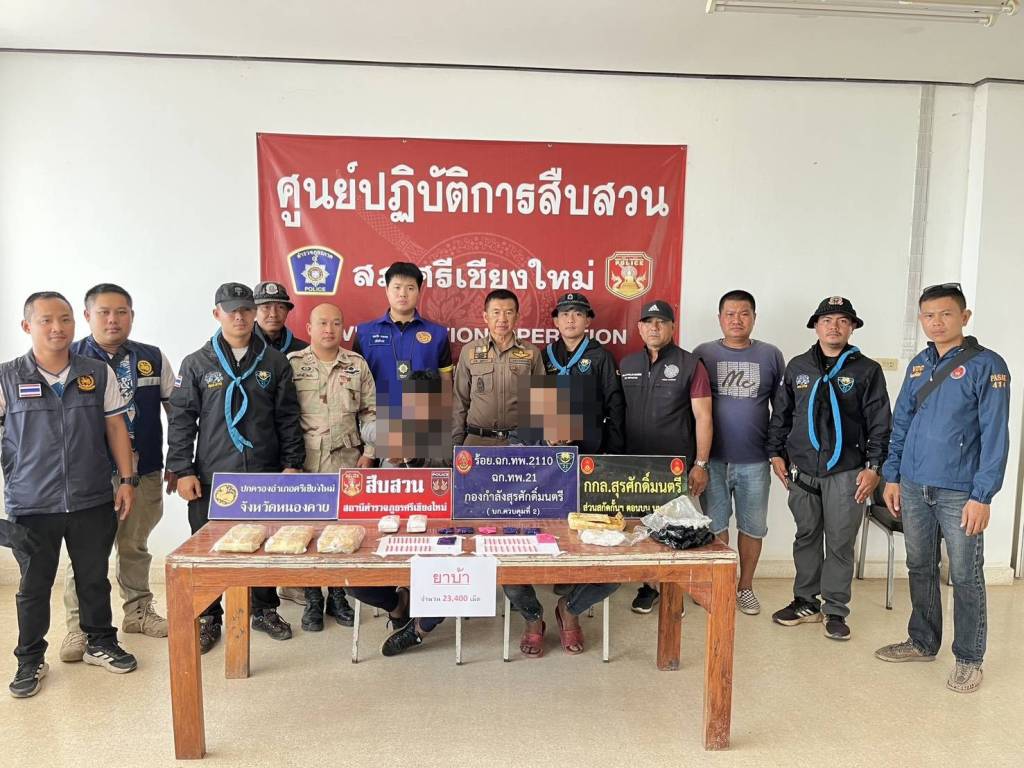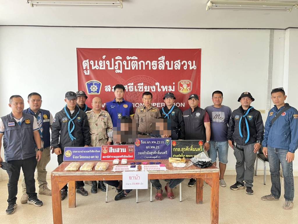 กองกำลังสุรศักดิ์มนตรี โดยกองร้อยเฉพาะกิจทหารพรานที่ 2110 หน่วยเฉพาะกิจทหารพรานที่ 21 ร่วมกับฝ่ายปกครองอำเภอศรีเชียงใหม่ เจ้าหน้าที่ตำรวจ สภ.ศรีเชียงใหม่ ร่วมกันจับกุมชาวจังหวัดอุบลราชธานี 2 ราย หลังมารับยาบ้าริมแม่น้ำโขงบ้านไทยเจริญ ต.พระพุทธบาท อ.ศรีเชียงใหม่ ของกลางยาบ้า 23,400 เม็ด