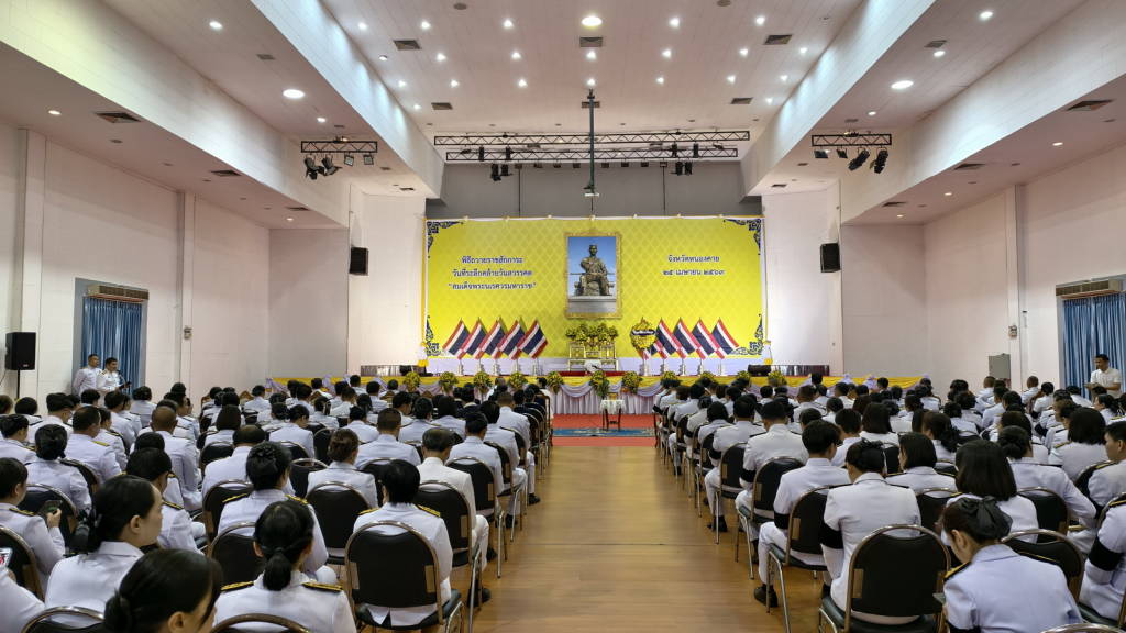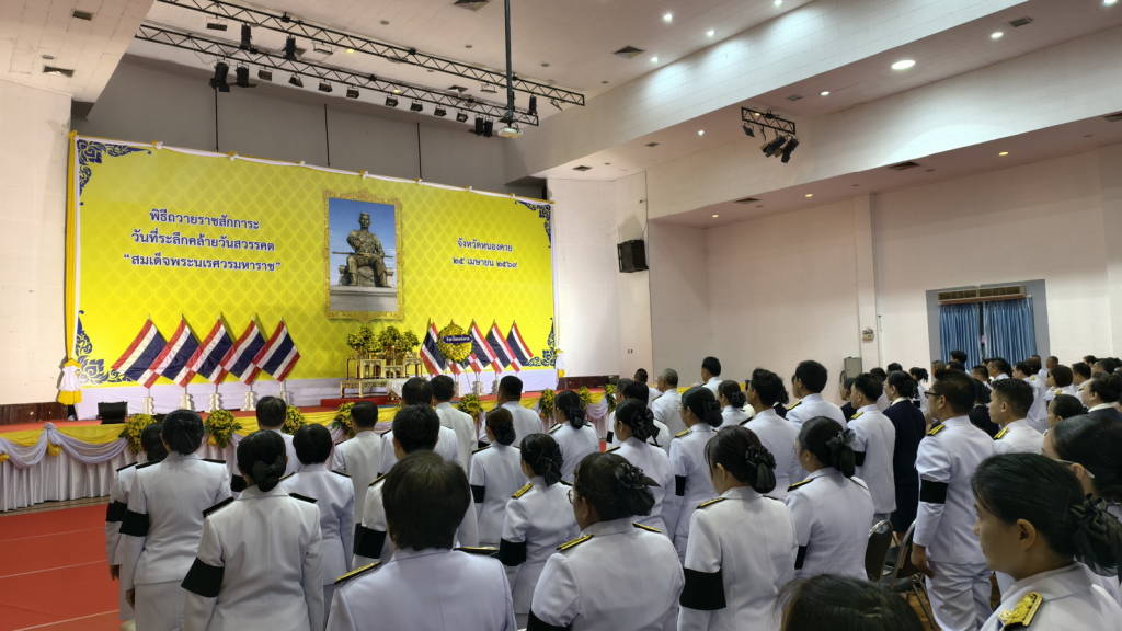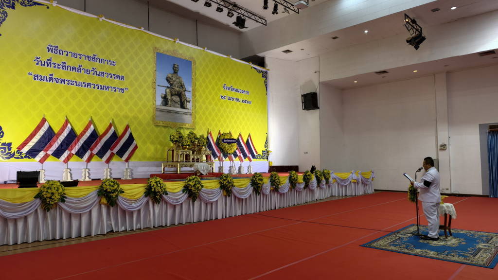 เมื่อเวลา 08.30 น.วันที่ 25 เมษายน 2569 ที่หอประชุมประจักษศิลปาคม ศาลากลางจังหวัดหนองคาย อ.เมืองหนองคาย จ.หนองคาย นายศรัณย์ศักด์ ศรีเครือเนตร ผู้ว่าราชการจังหวัดหนองคาย เป็นประธานในพิธีวางพวงมาลาและถวายราชสดุดีเนื่องในวันที่ระลึกคล้ายวันสวรรคต “สมเด็จพระนเรศวรมหาราช” ประจำปีพุทธศักราช 2569