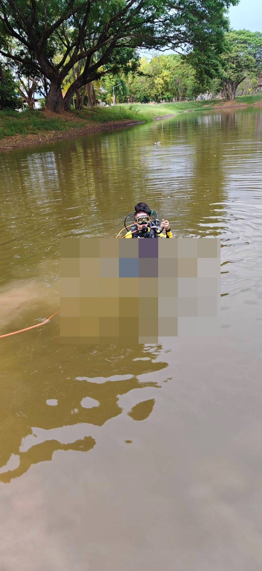 ที่เกิดเหตุเป็นสระน้ำภายในสวนสาธารณะสวนสมเด็จย่า มีระดับน้ำลึกประมาณ 3 เมตร เจ้าหน้าที่ชุดประดาน้ำใช้เวลาปูพรมค้นหาประมาณ 1 ชั่วโมง จึงสามารถนำร่างผู้เสียชีวิตที่จมอยู่ใต้น้ำขึ้นมาได้ ทราบชื่อคือ เด็กหญิงกัญญาณัฐ นาพิน อายุ 6 ปี อยู่บ้านเลขที่ 70 หมู่ 1 ตำบลน้ำโมง อำเภอท่าบ่อ จังหวัดหนองคาย โดยสภาพร่างที่พบ ไม่สวมเสื้อผ้า