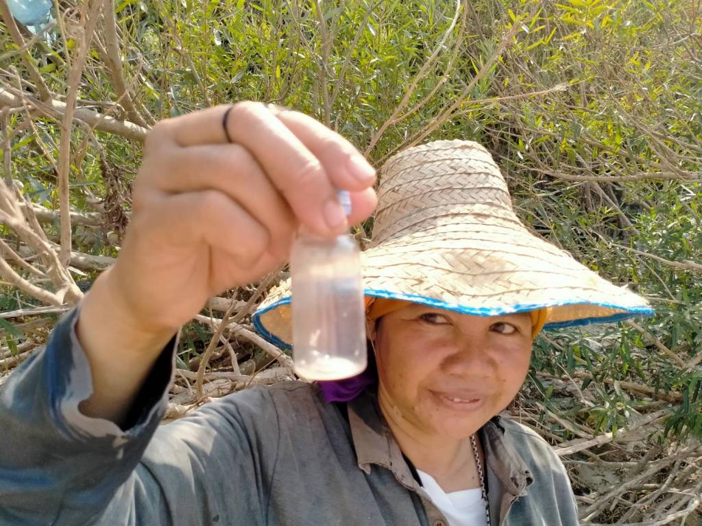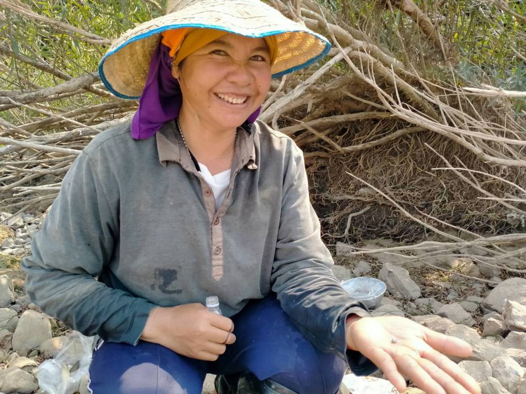นางน้อม บอกกับผู้สื่อข่าวว่า การร่อนหาทองคำในแม่น้ำโขงไม่ได้ง่ายๆ เหมือนแต่ก่อน ในแต่ละวันหาร่อนทองได้เท่าหัวเม็ดไม้ขีดไฟ หรือประมาณ 2 มิลลิเมตร จะได้น้อยได้มากแล้วแต่โอกาส แล้วแต่โชคช่วย เศษแร่ทองที่ร่อนได้จะรวบรวมไปขายให้ร้านทองในตัวอำเภอ หรือไม่ก็จะรอให้มีคนของร้านทองออกมาหาซื้อถึงบ้าน แต่ไม่ได้ขายทุกวัน